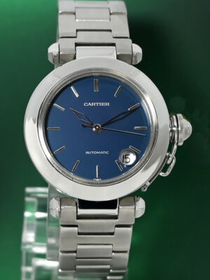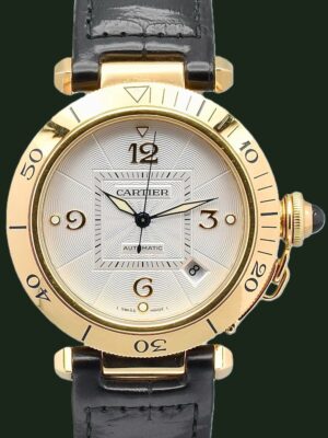 Cartier Pasha 2392 Automatic Date 18k Gold 38mm Open Back Silver Guilloche Dial Full Set OUR PRICE: 8,750.00 €