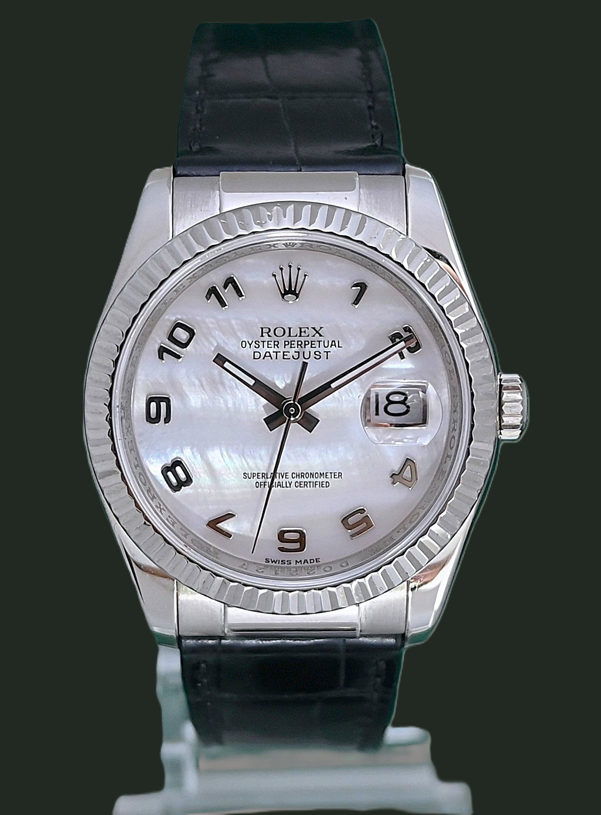 The Rolex Datejust 36 Reference 116139 with a Mother of Pearl (MOP) Dial is a discontinued luxury timepiece crafted entirely from 18k white gold. Unlike most Datejust models that feature a metal bracelet, the 116139 was uniquely designed to be worn on a leather strap with integrated "lug hoods" for a seamless look.