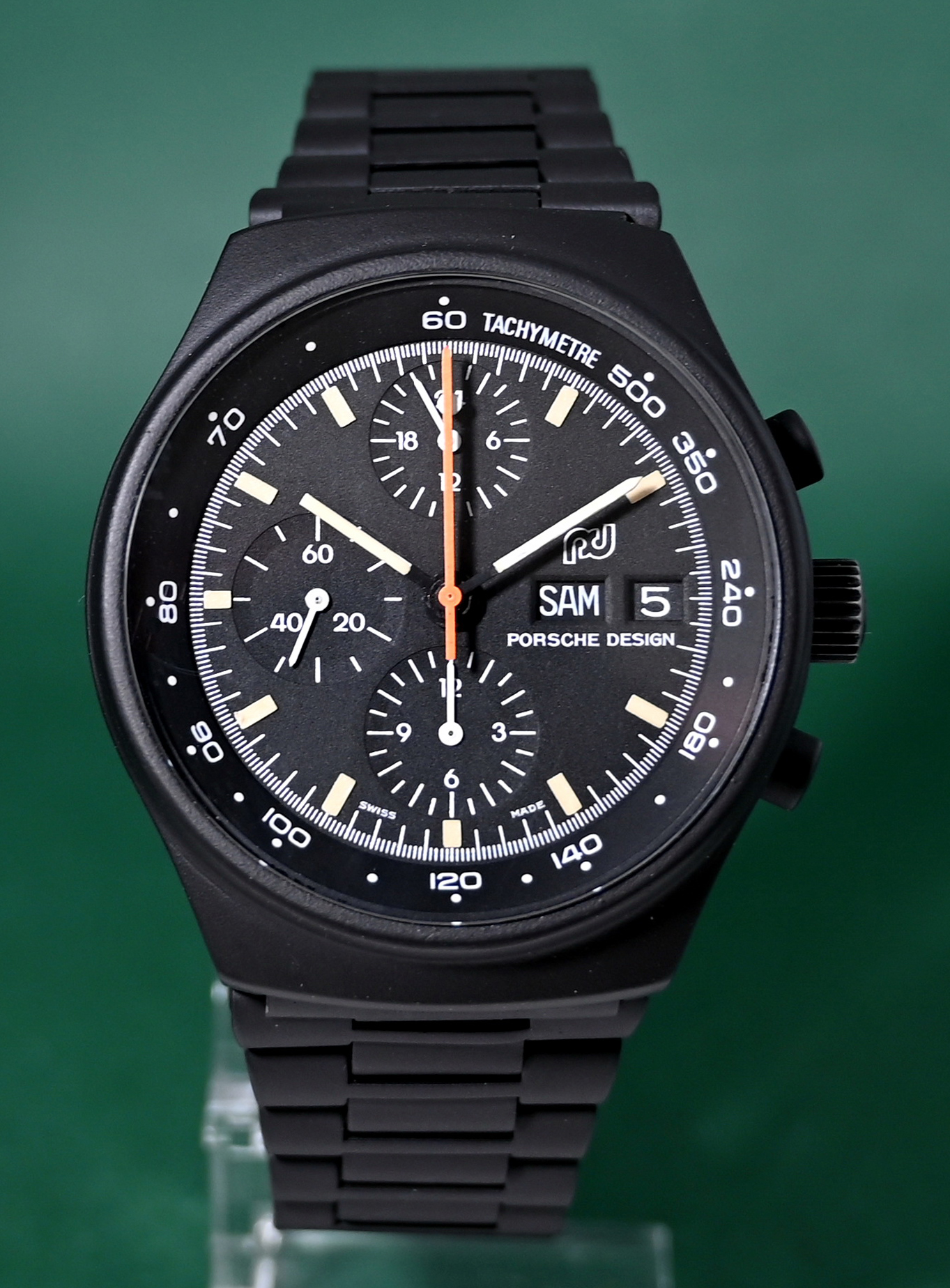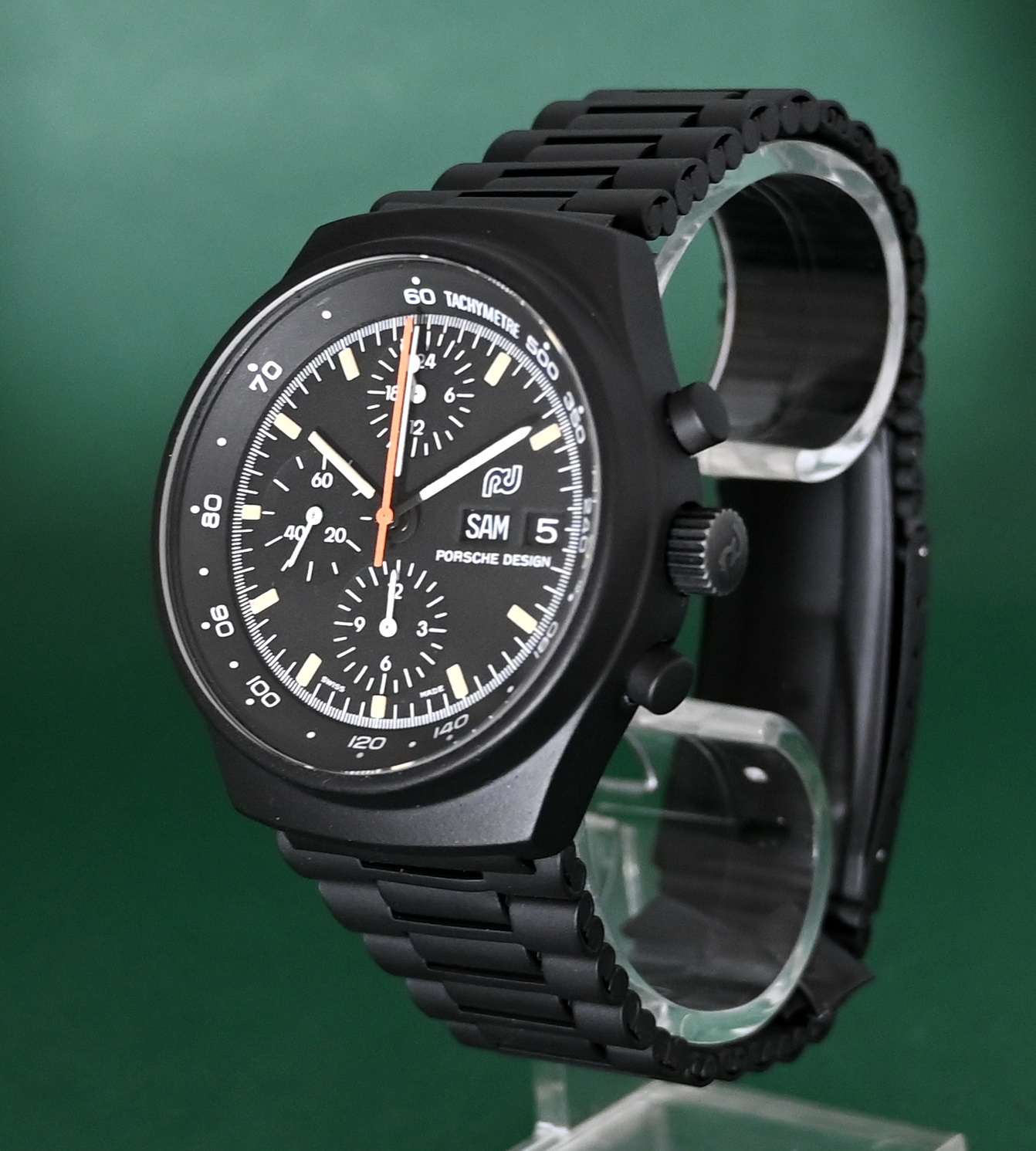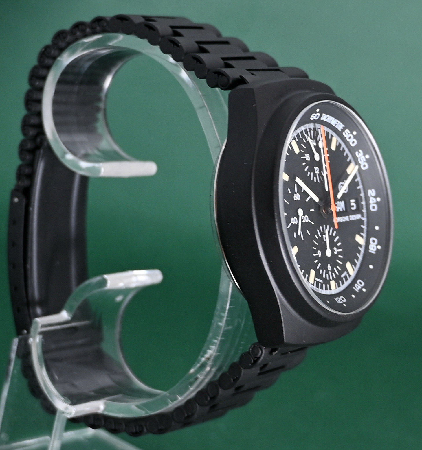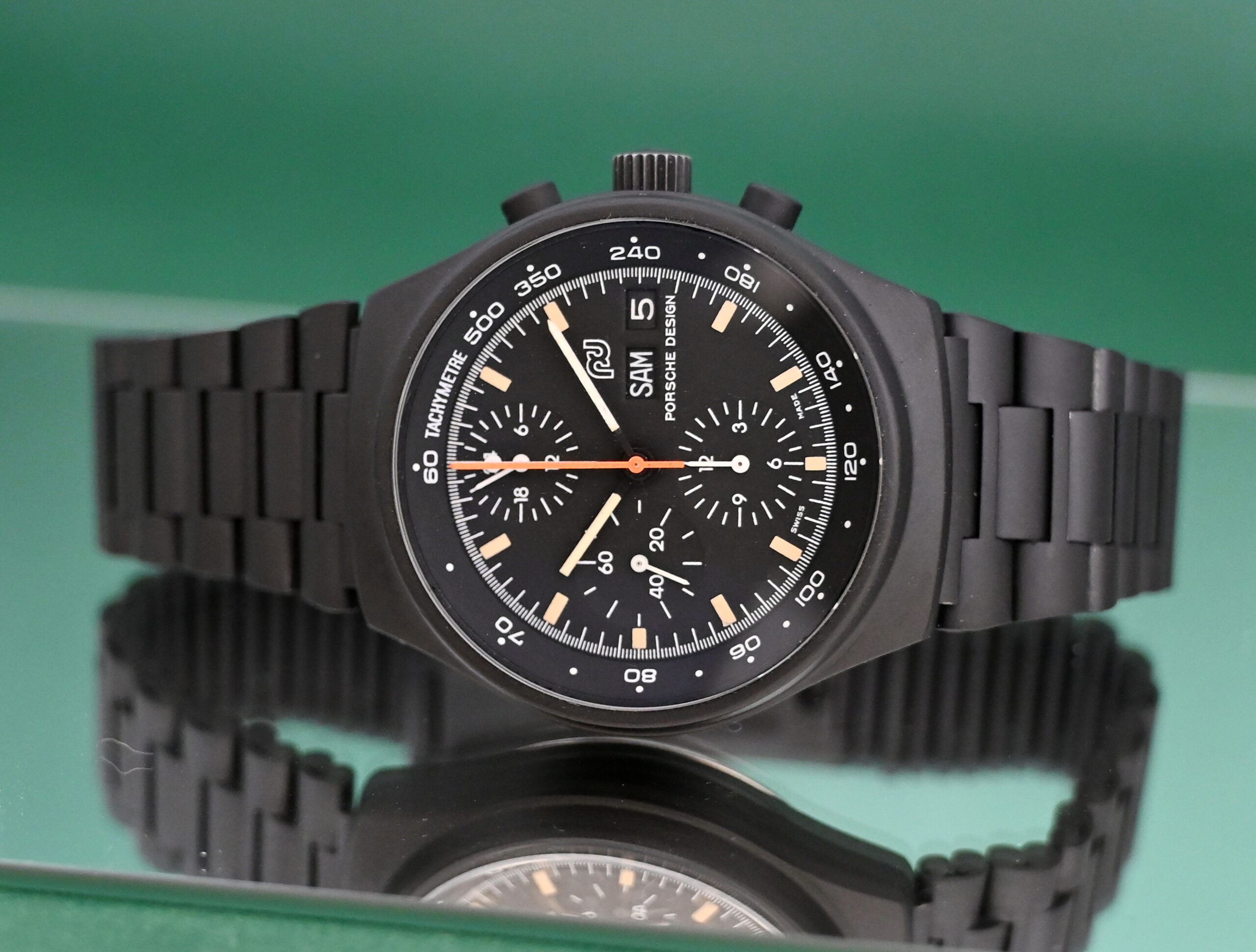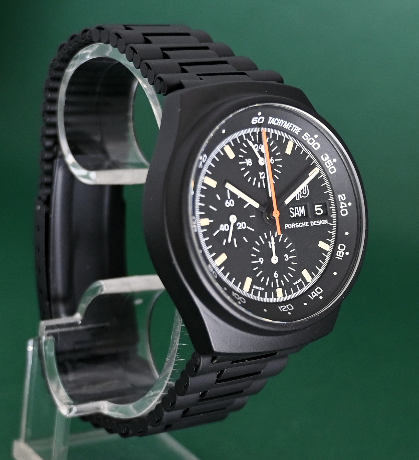 The watch Tom Cruise wore during Top Gun was a Porsche Design chronograph in stainless steel, with a black PVD-coating, produced by Orfina, and powered by a Lemania 5100, with central minutes and seconds. This watch was one of the first on the market with a black PVD coating, not for fashion, but because the matte black treatment reduced reflections.