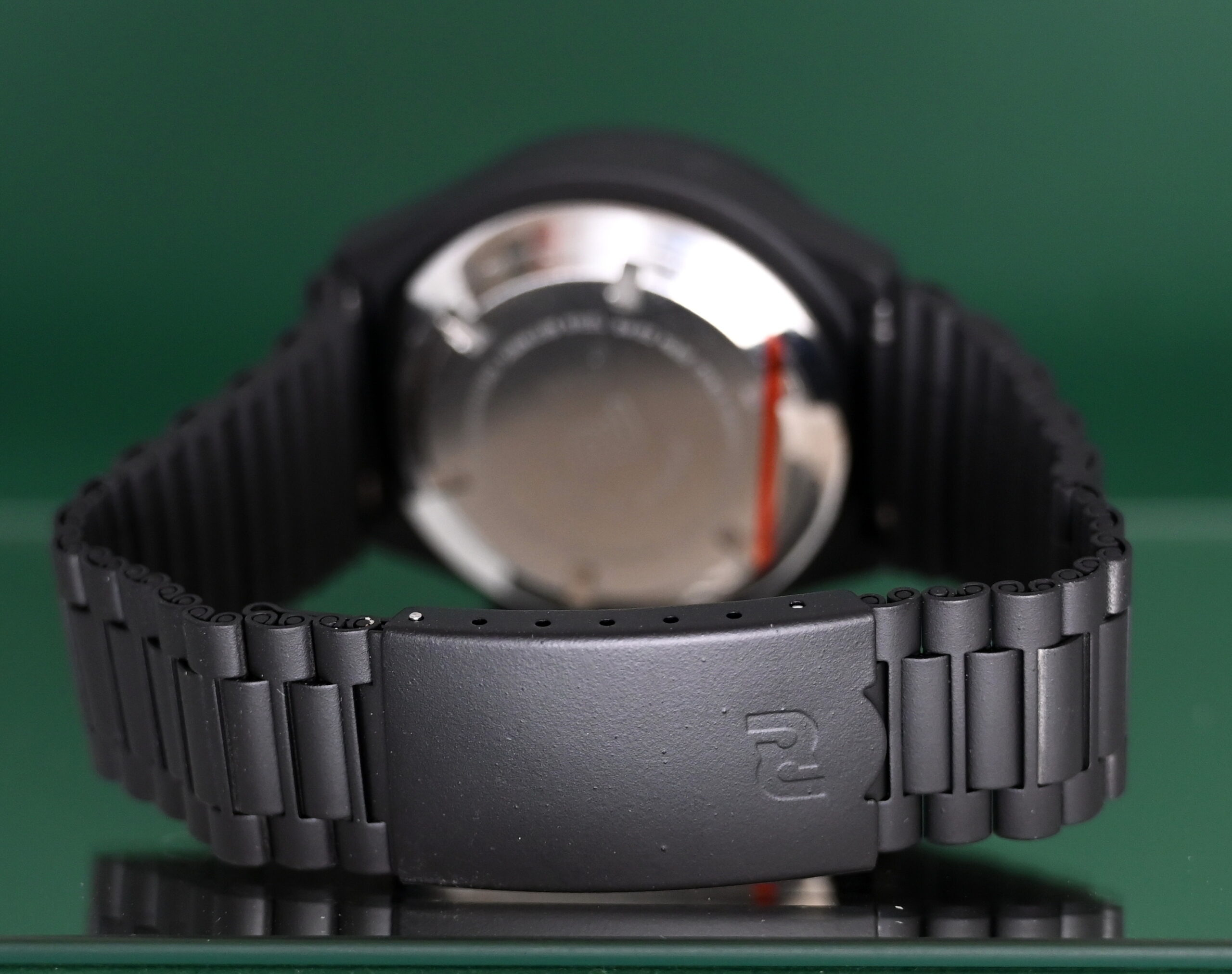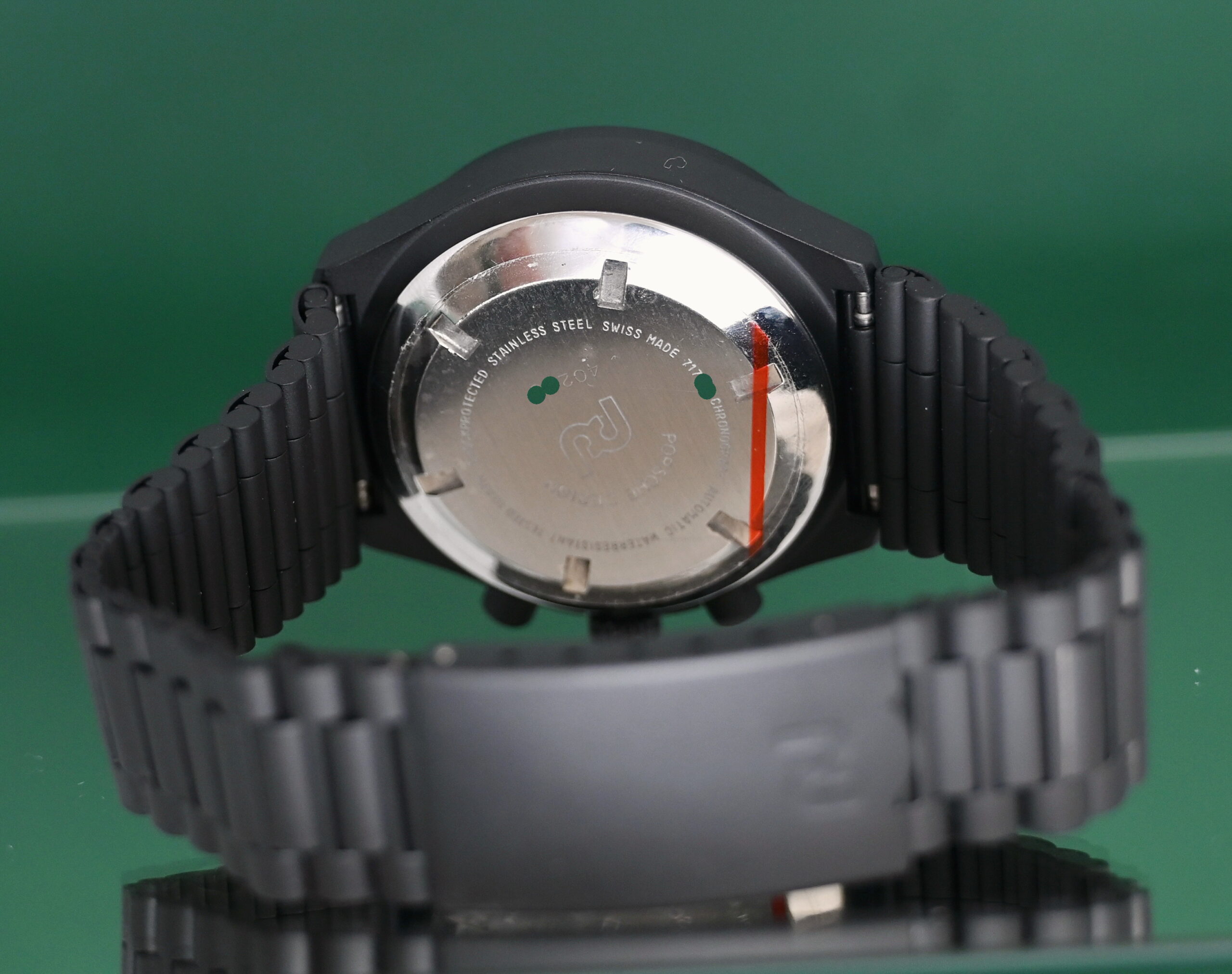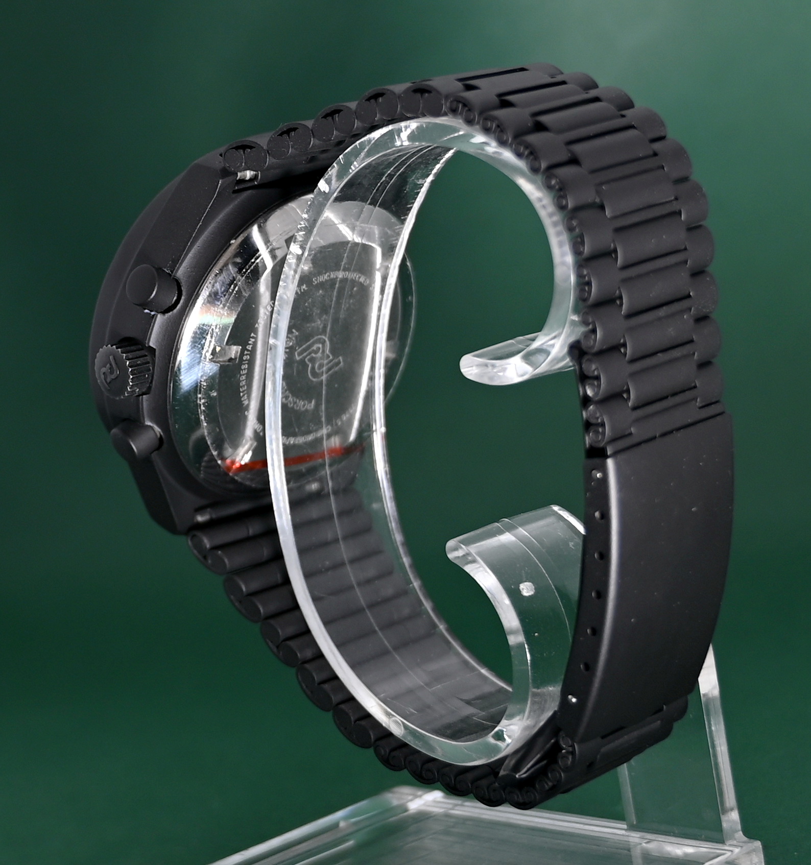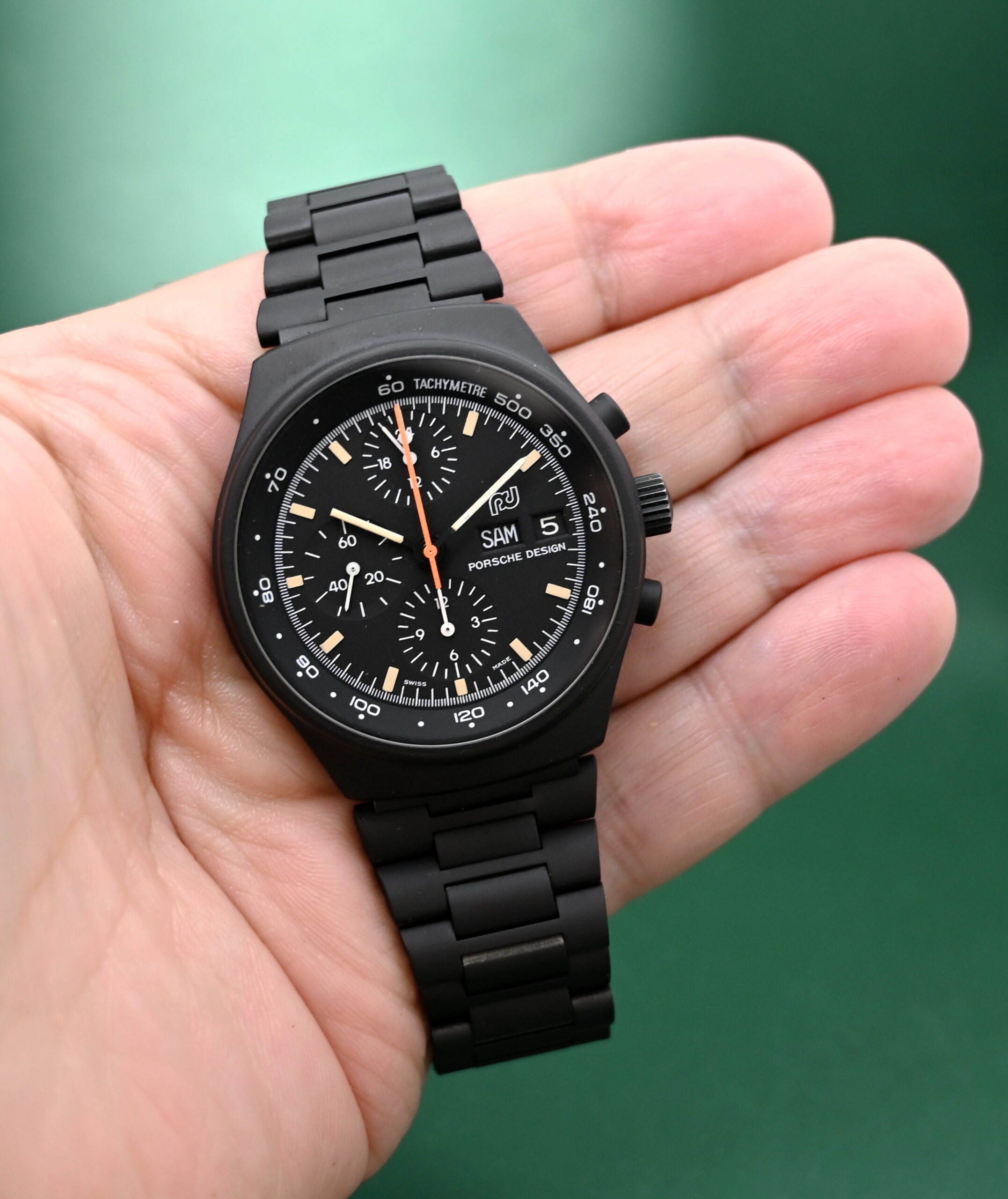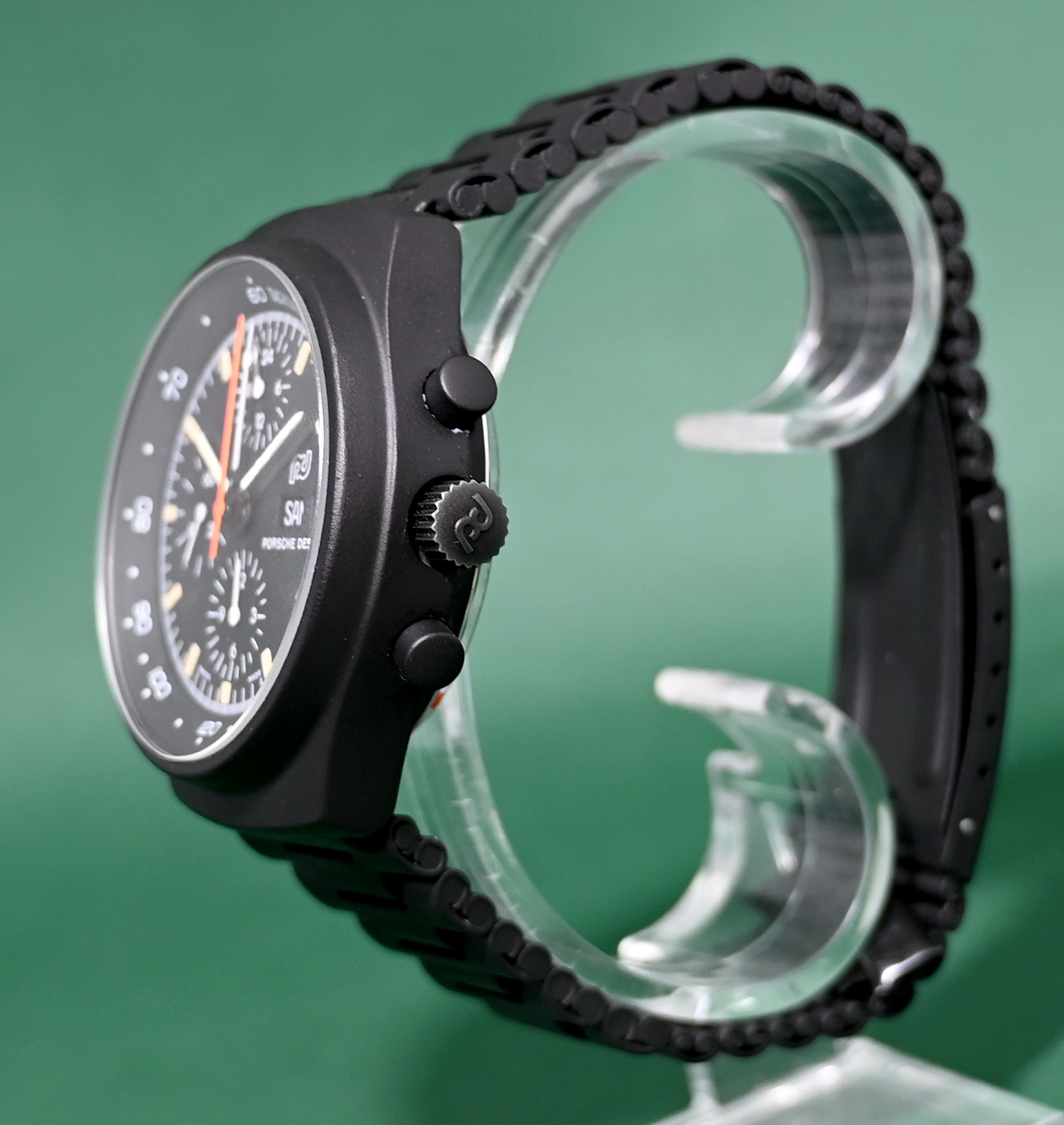 The watch Tom Cruise wore during Top Gun was a Porsche Design chronograph in stainless steel, with a black PVD-coating, produced by Orfina, and powered by a Lemania 5100, with central minutes and seconds. This watch was one of the first on the market with a black PVD coating, not for fashion, but because the matte black treatment reduced reflections.