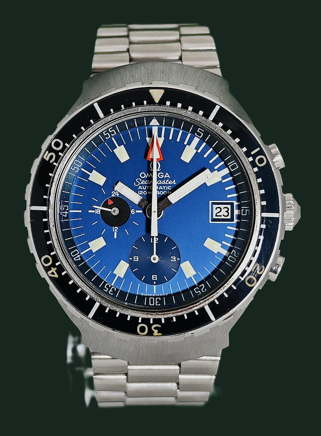 The Omega Seamaster "Big Blue" (Reference 176.004) is a historic 1970s diving chronograph, distinguished as the world's first automatic diver's chronograph that was truly water-resistant and functional to depths of 120 meters (400 feet). Produced between approximately 1972 and 1977, its massive, helmet-shaped case and vibrant blue aesthetic have made it a high-target collector's piece.