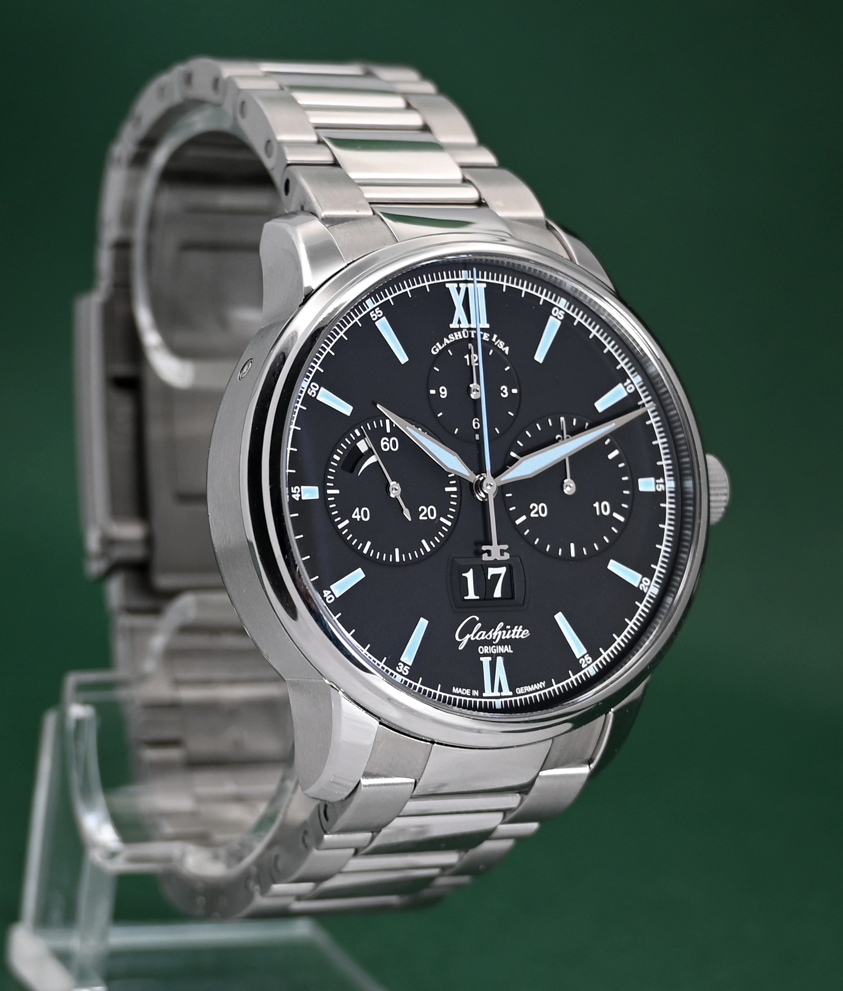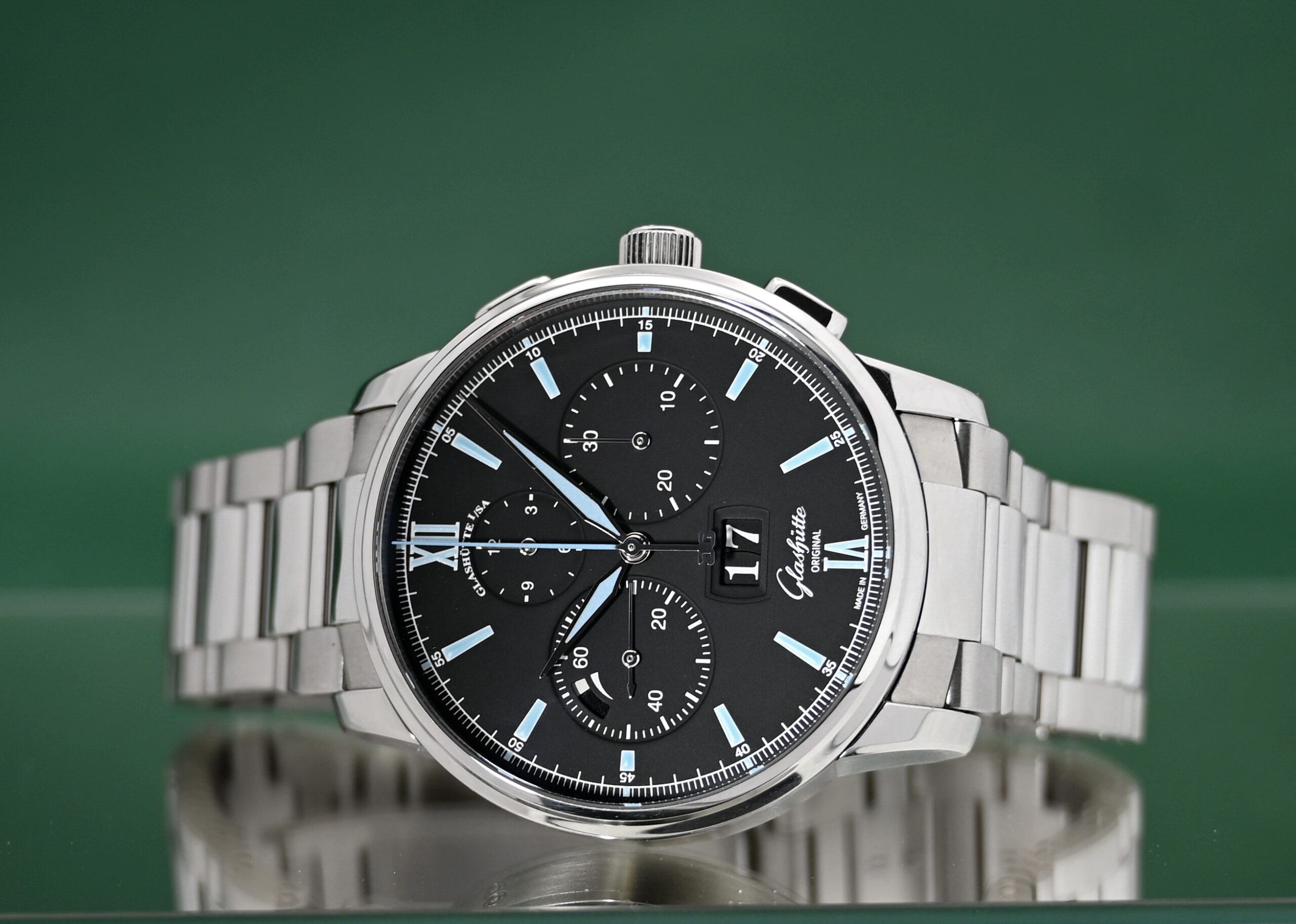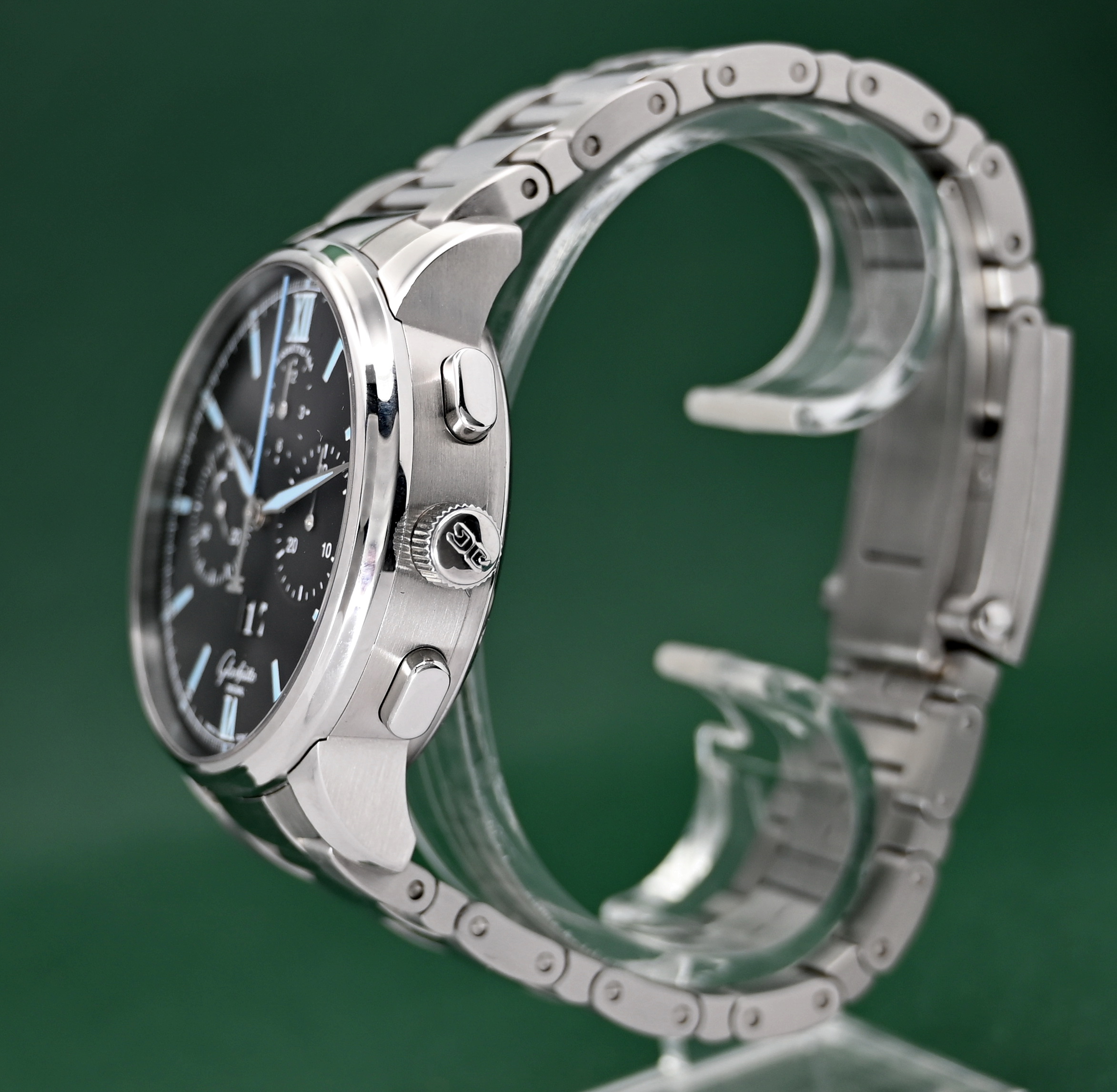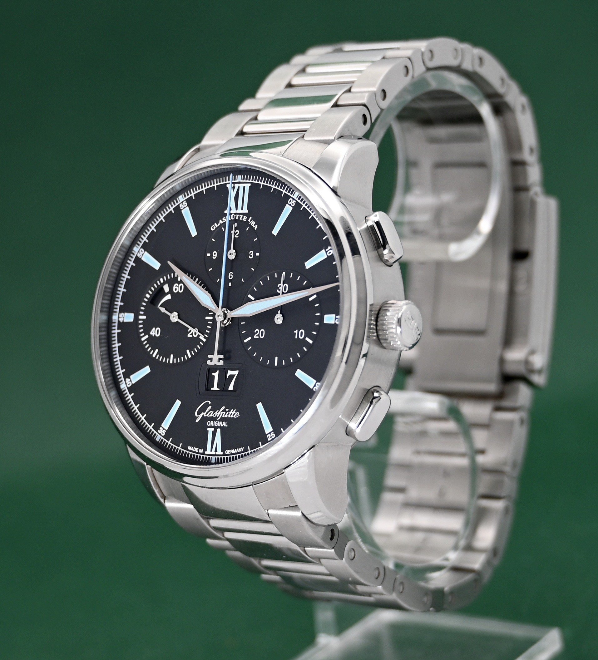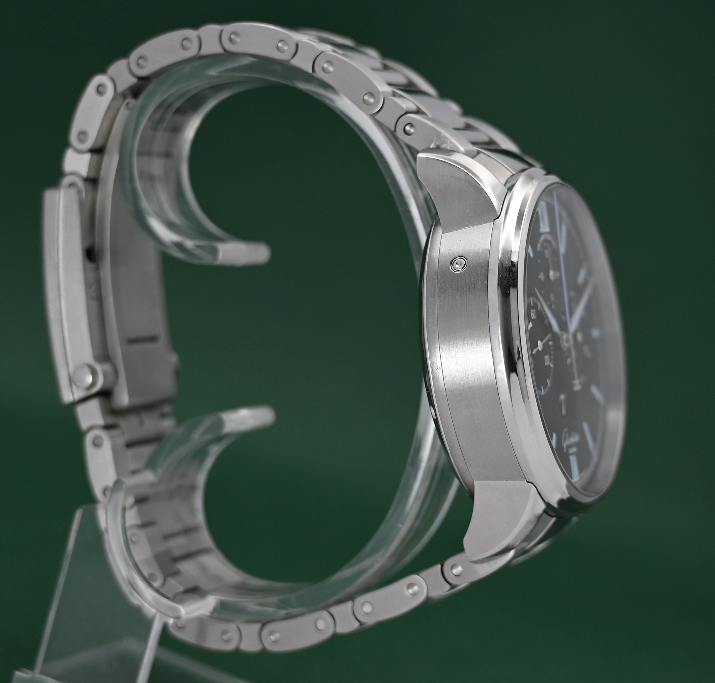 Officially launched in 2014, Glashütte Original’s newly developed Calibre 37 is an integrated chronograph movement that features innovative, compact and highly functional design, and offers exquisite precision and reliable performance. Its alluring deep black dial is set off by high-contrast white print and enhanced by the generous use of radiant blue Super-LumiNova, which highlights the white gold hour, minute and stop seconds hands, Roman numerals at hours 6 and 12 and all hour indexes, permitting excellent legibility even in the dark. Glashütte Original’s unique Panorama Date window is positioned centrally in the lower half of the dial beneath the upper-half triad formed by 30-minute and 12-hour chronograph counters and the small seconds display, in which the power reserve display is charmingly integrated. A substantial, alternately polished and satin-brushed 42 mm stainless steel case adds cool and convincing elegance to this robust, casually stylish and sporty new version. Developed to meet most demanding standards of functionality and optimised for everyday use, the manufactory Calibre 37-01 chronograph movement’s fully integrated, compact construction with flyback mechanism and 12-hour chronograph counter make it a reliable, precise and aesthetically satisfying companion for day-to-day wear. The 4Hz automatic manufactory movement assures maximum functionality through its efficient and compact method of construction. An example is the switch lever; in the Calibre 37 series chronographs, in contrast to previous designs, the lever is comprised of only one part. With a power reserve of 70 hours when fully wound, the automatic Calibre 37-01 represents an absolute peak value in the realm of mechanical chronographs. In order to keep the performance and amplitude stable over the entire period of time, a new oscillation system with low energy requirements was developed, effectively governed by a single spring barrel. Optimal translation between spring barrel and oscillation system assures extremely stable and precise performance with no deviations over 70 hours.