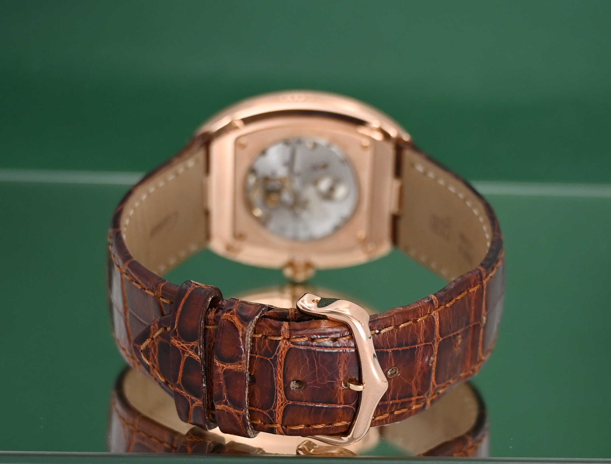 The Cartier Baignoire XL (Reference 3033) is a prestigious 18k rose gold timepiece known for its substantial proportions and rare manual-wind movement. Unlike many quartz-based Baignoire models, this reference features an exhibition caseback that showcases the mechanical caliber.