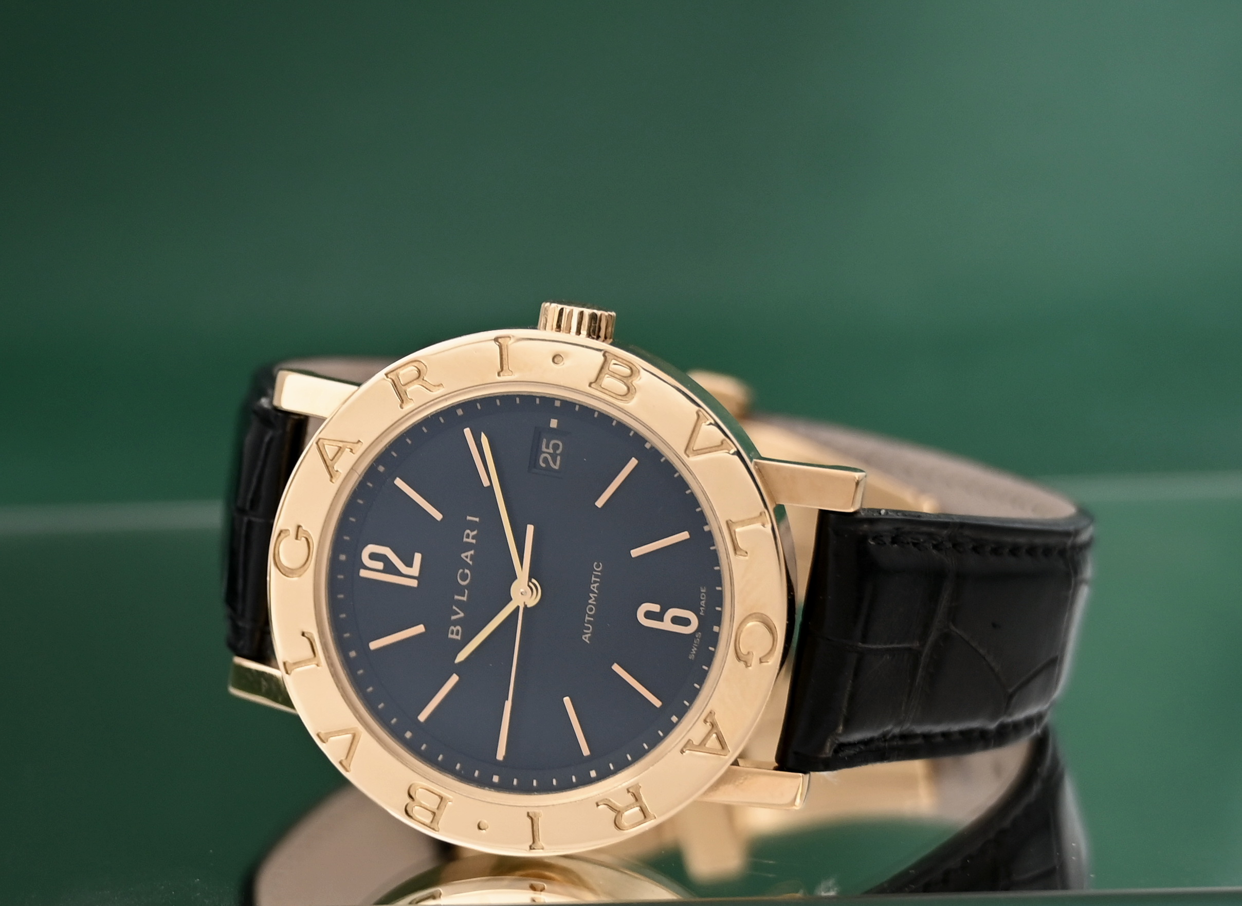 Inquire - Bvlgari BB38GL 38mm Automatic Date 18k Gold Folding Clasp Black Dial