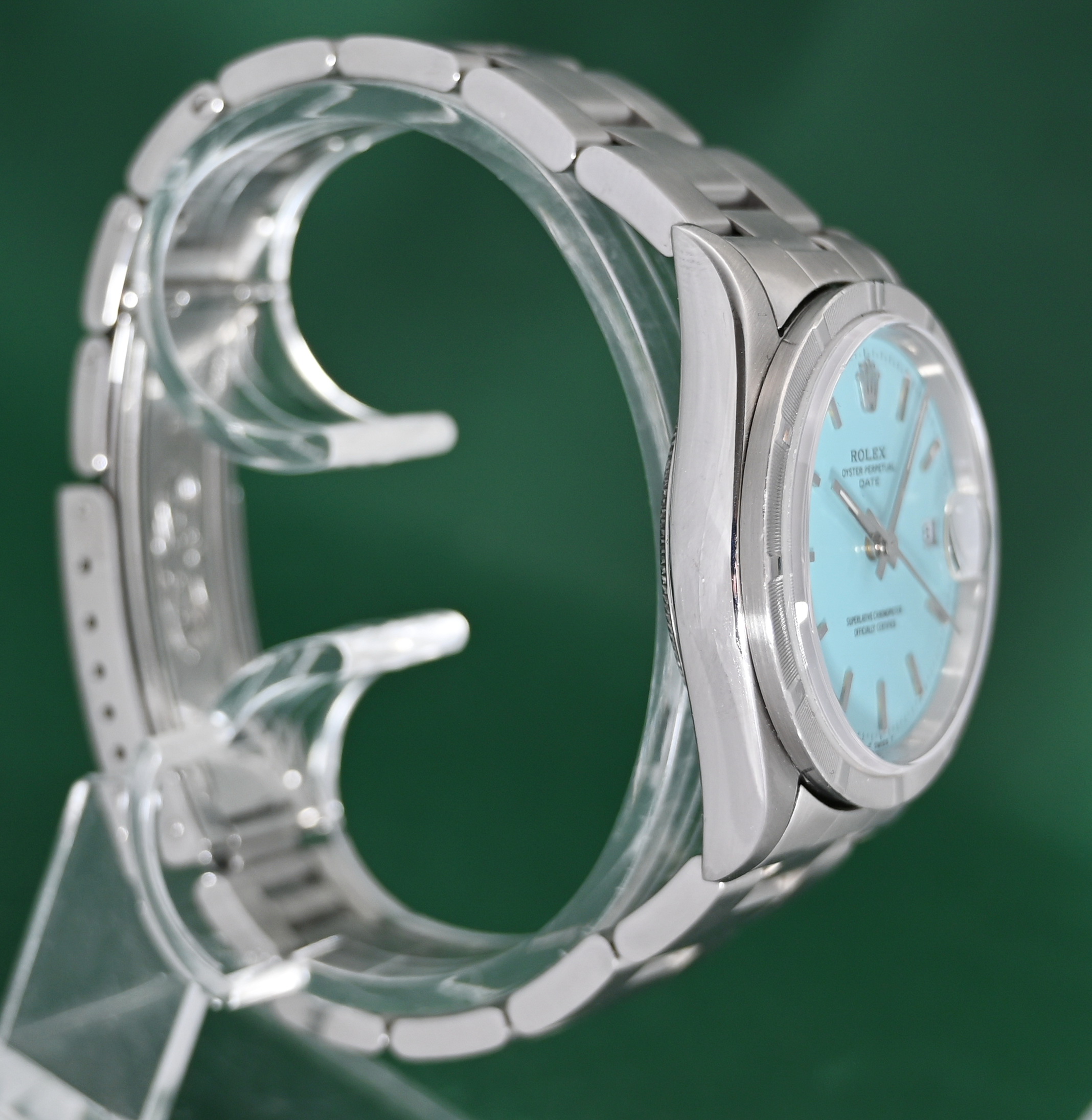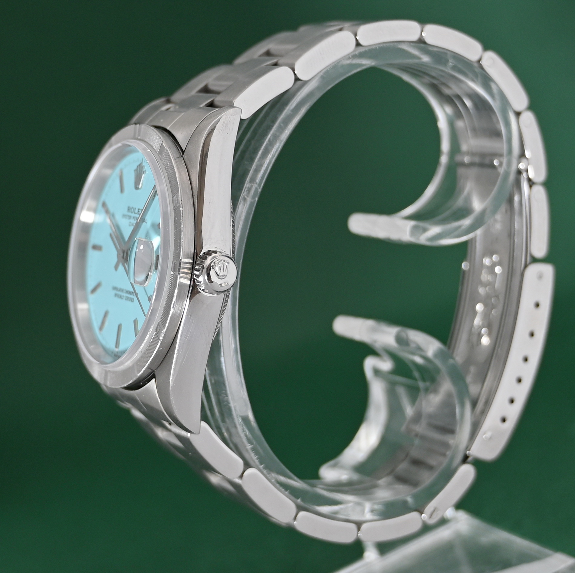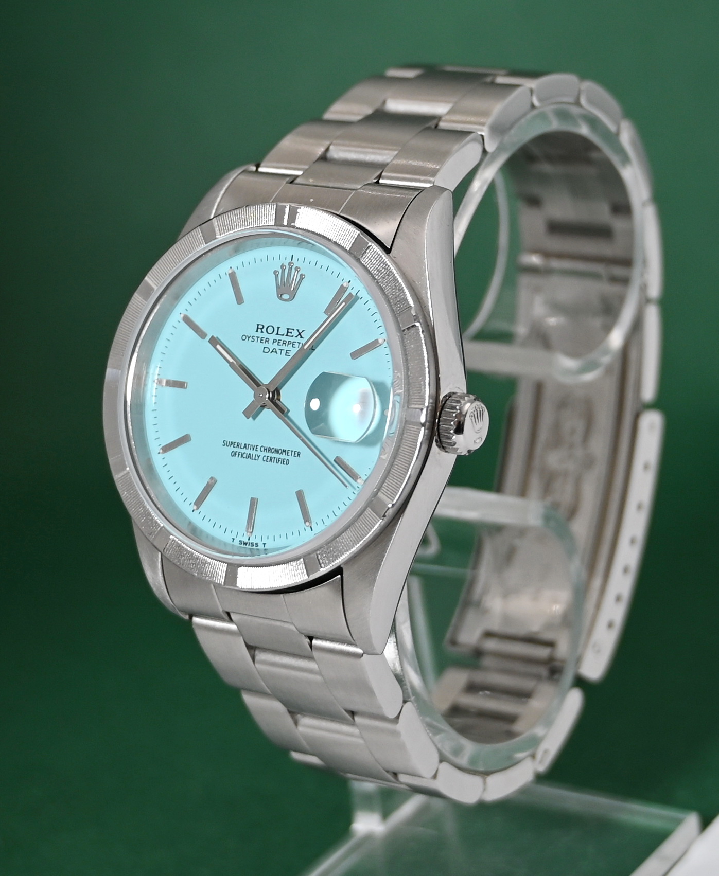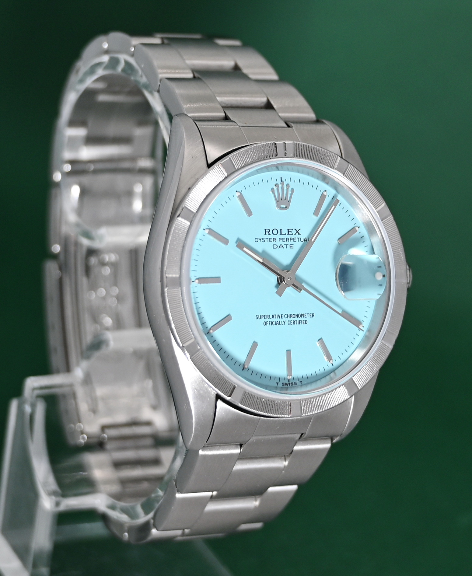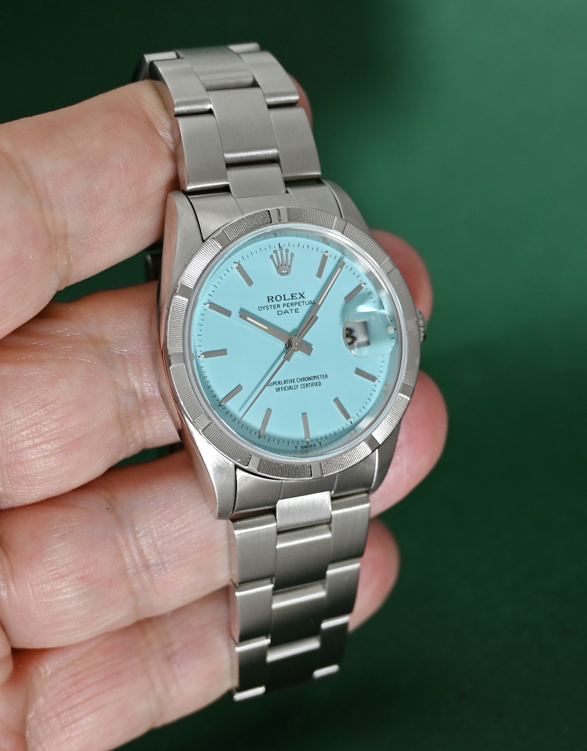 The Rolex Oyster Perpetual Date (Ref. 15210) is a 34mm stainless steel model originally produced from approximately 1988 into the mid-2000s. While highly collectible, it is important to note that a "Turquoise" or "Tiffany Blue" dial was not a factory option during its original production era. Such dials on this reference are almost exclusively custom aftermarket additions or refinished originals designed to mimic the popular modern 124300 series.