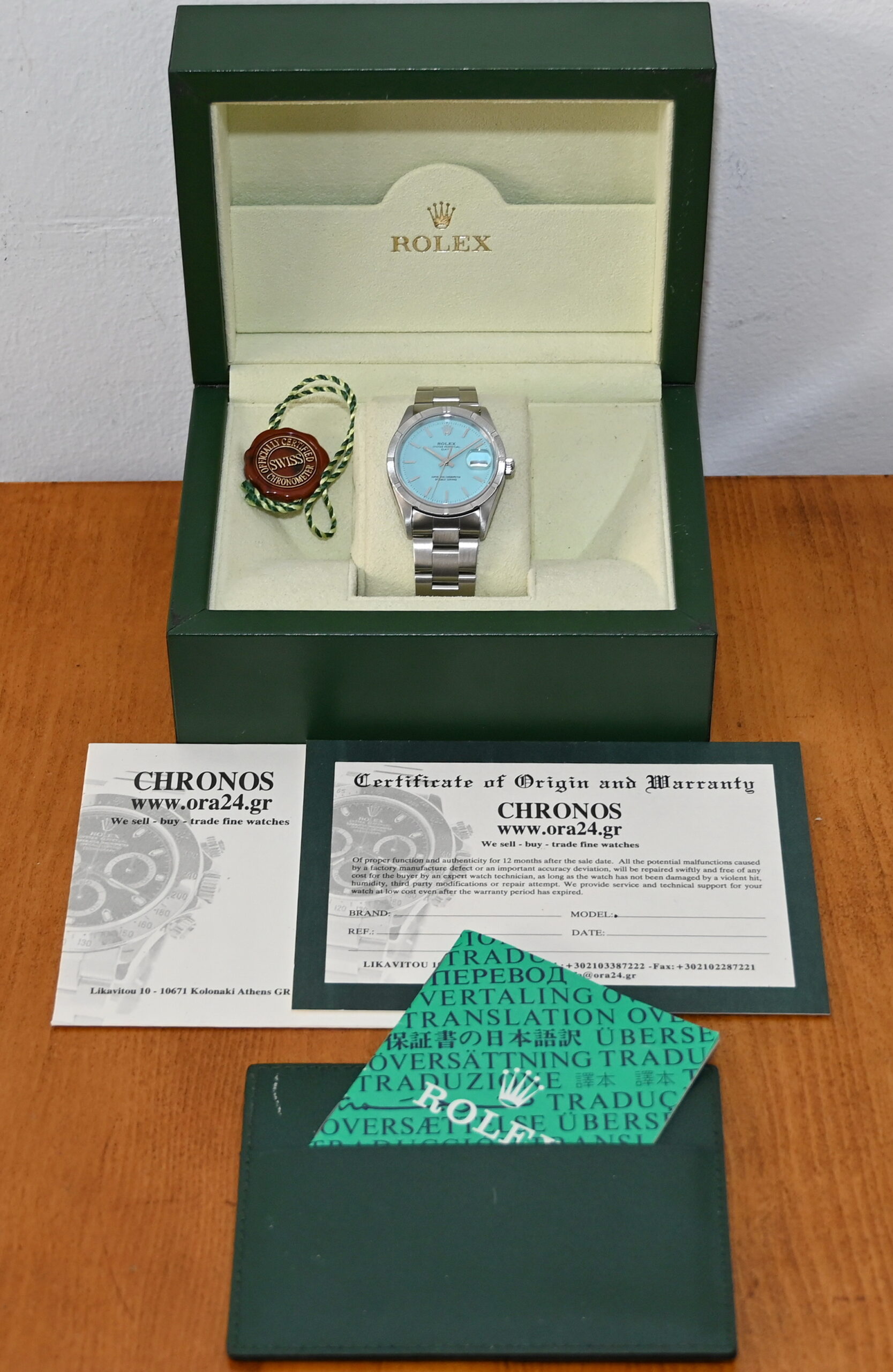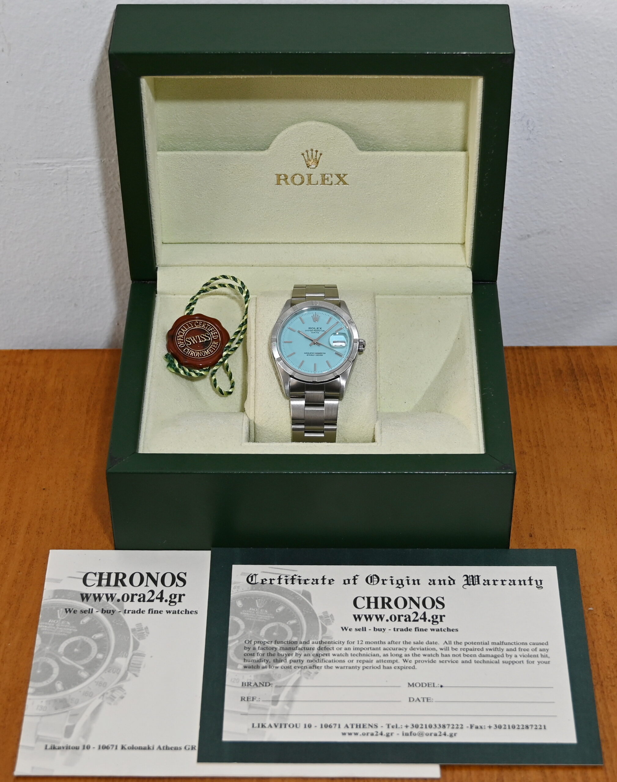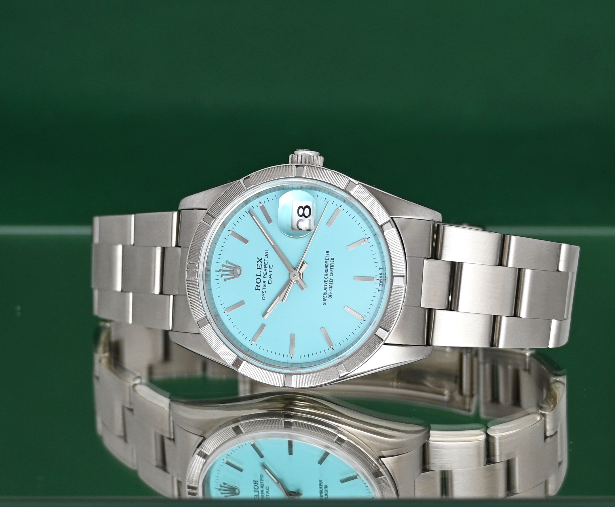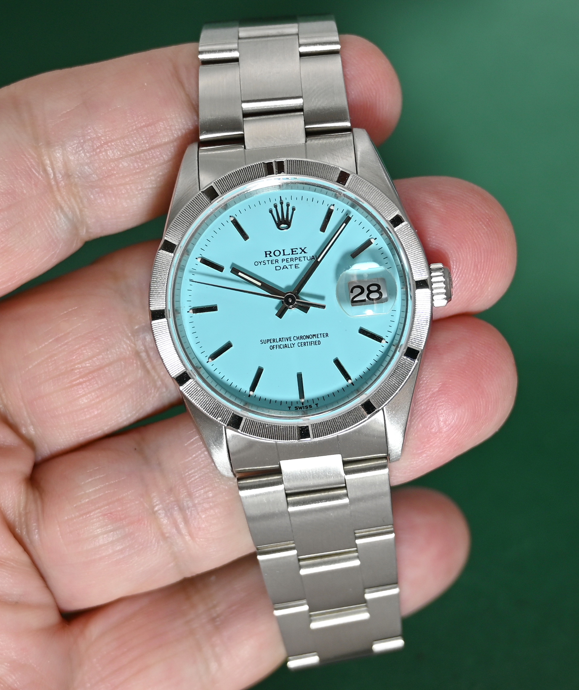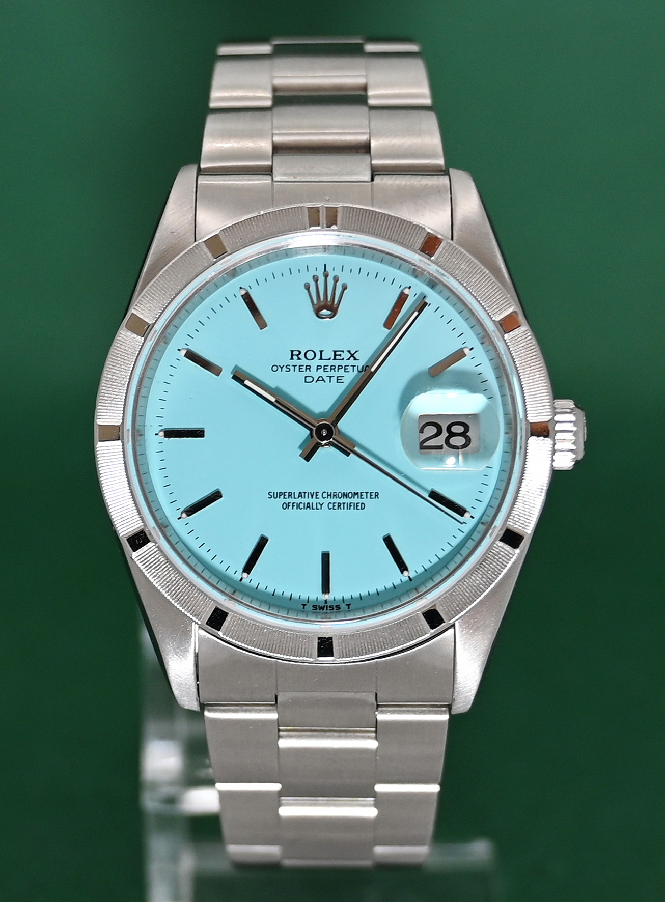 The Rolex Oyster Perpetual Date (Ref. 15210) is a 34mm stainless steel model originally produced from approximately 1988 into the mid-2000s. While highly collectible, it is important to note that a "Turquoise" or "Tiffany Blue" dial was not a factory option during its original production era. Such dials on this reference are almost exclusively custom aftermarket additions or refinished originals designed to mimic the popular modern 124300 series.