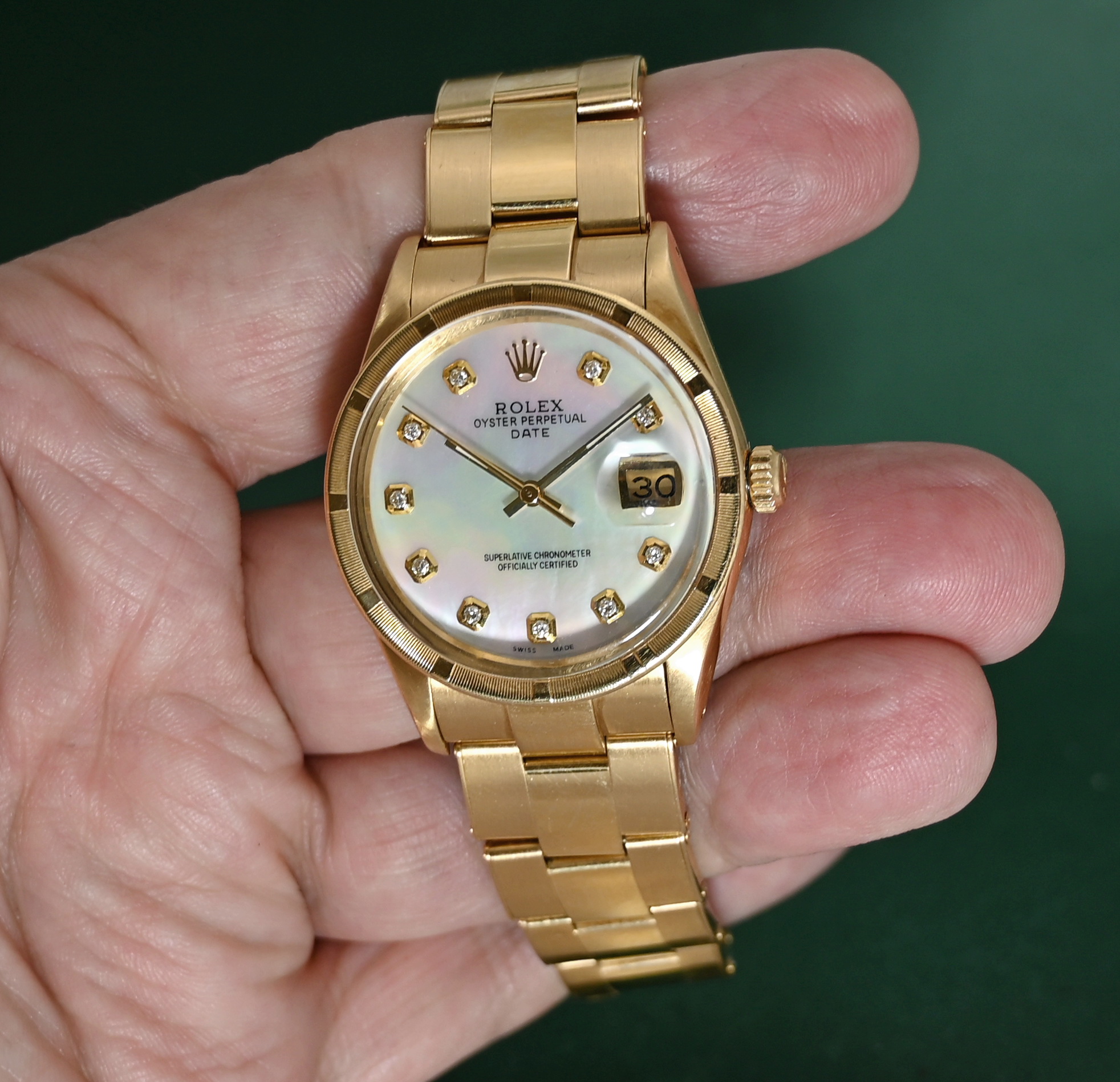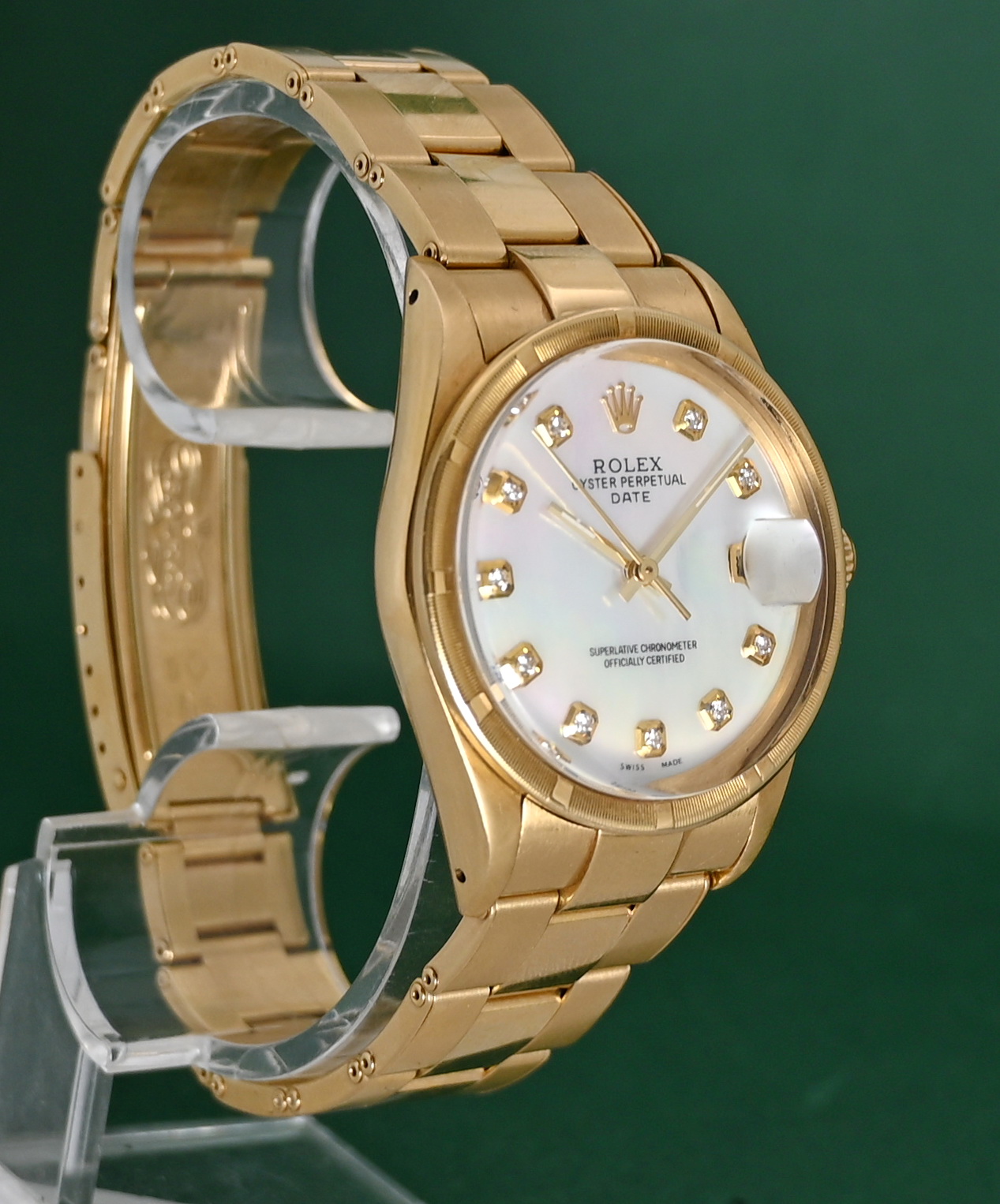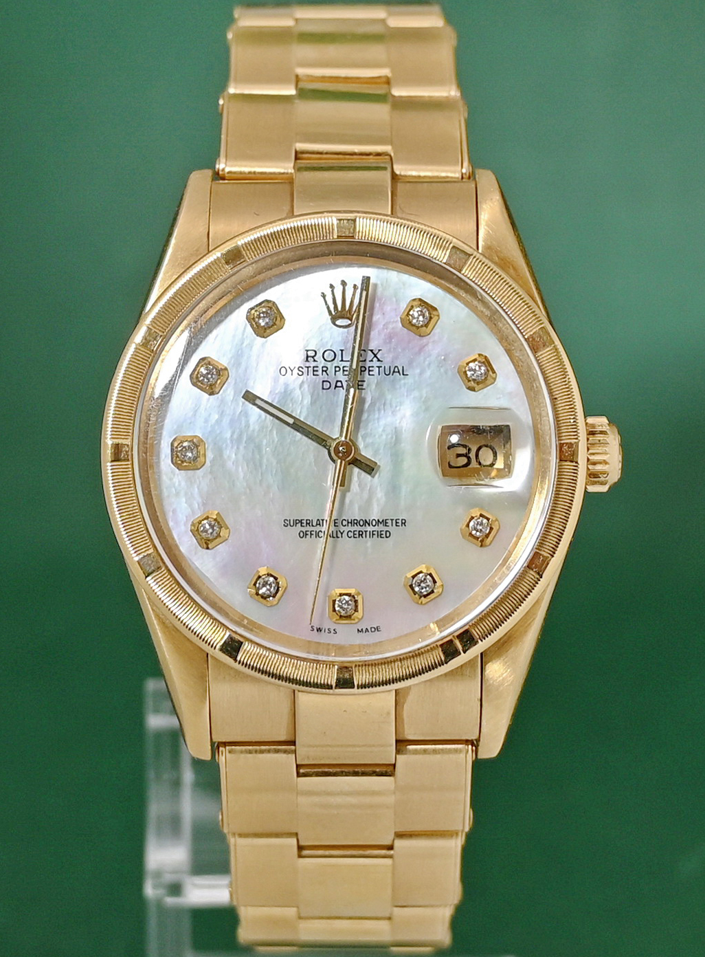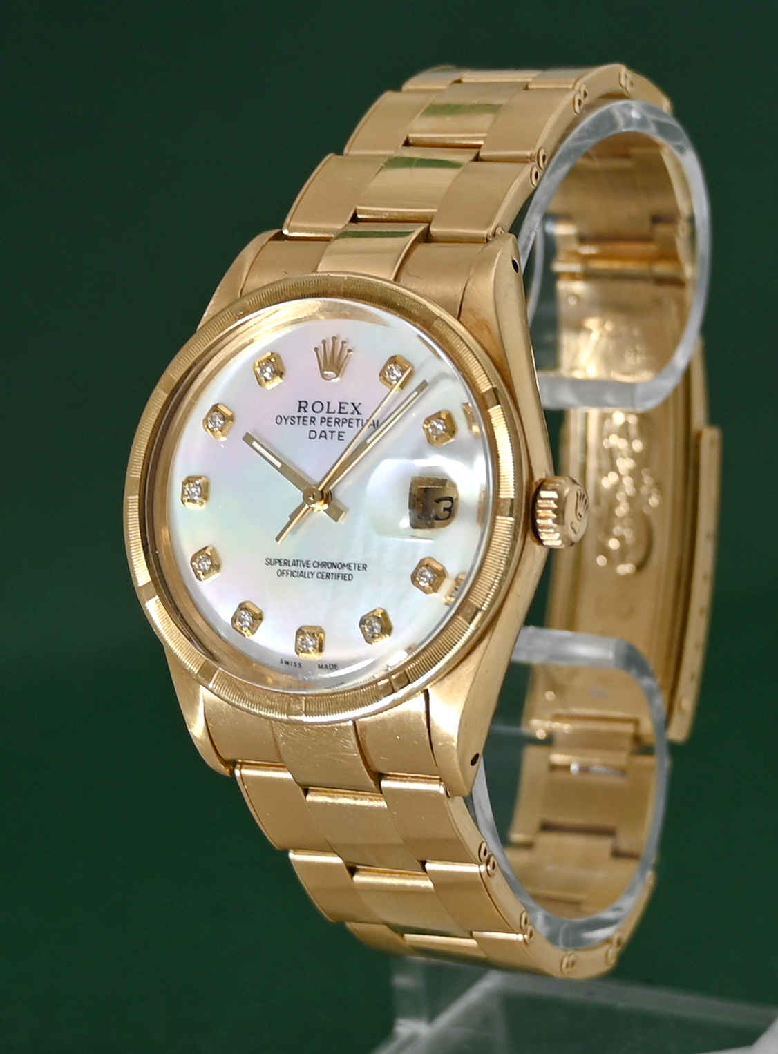 The Rolex Oyster Perpetual Date (Reference 15018) from 1984 is a rare, luxury vintage timepiece characterized by its 18k solid yellow gold construction and mid-size 34mm case. While this model standardly featured champagne or silver dials, the inclusion of a Mother of Pearl (MOP) dial makes it a particularly distinctive "boutique" configuration for collectors.