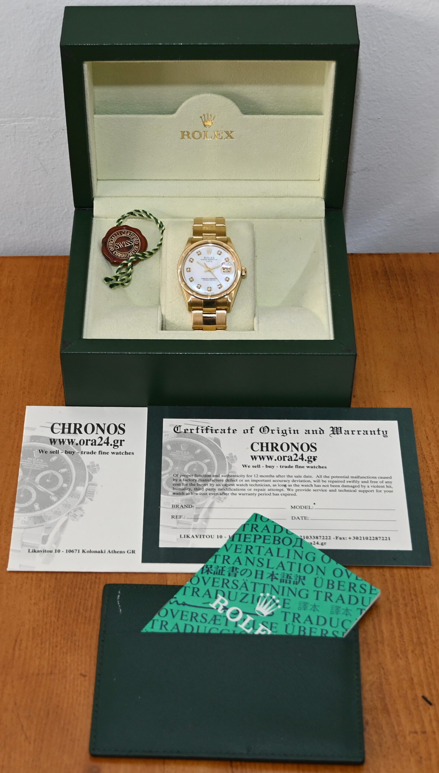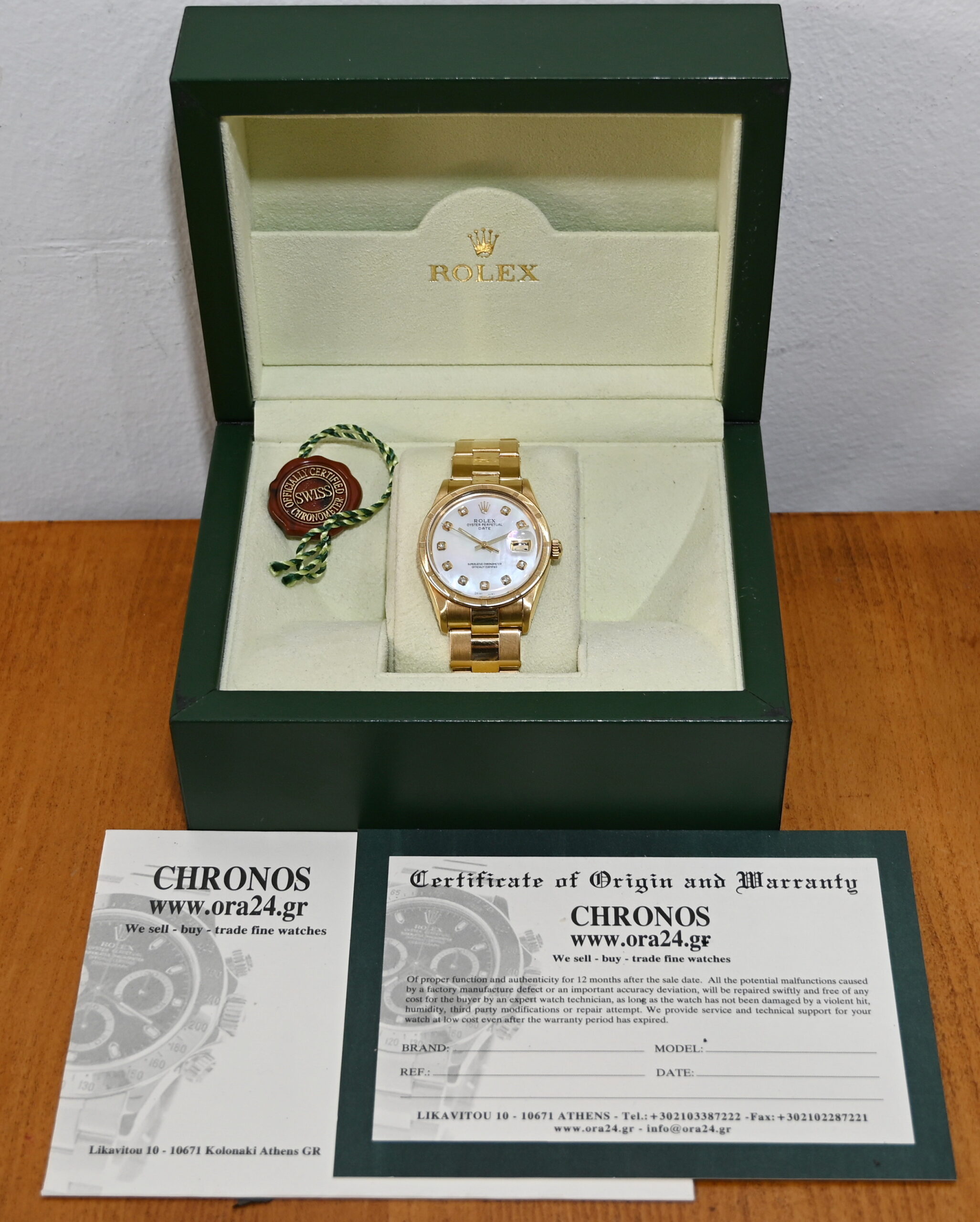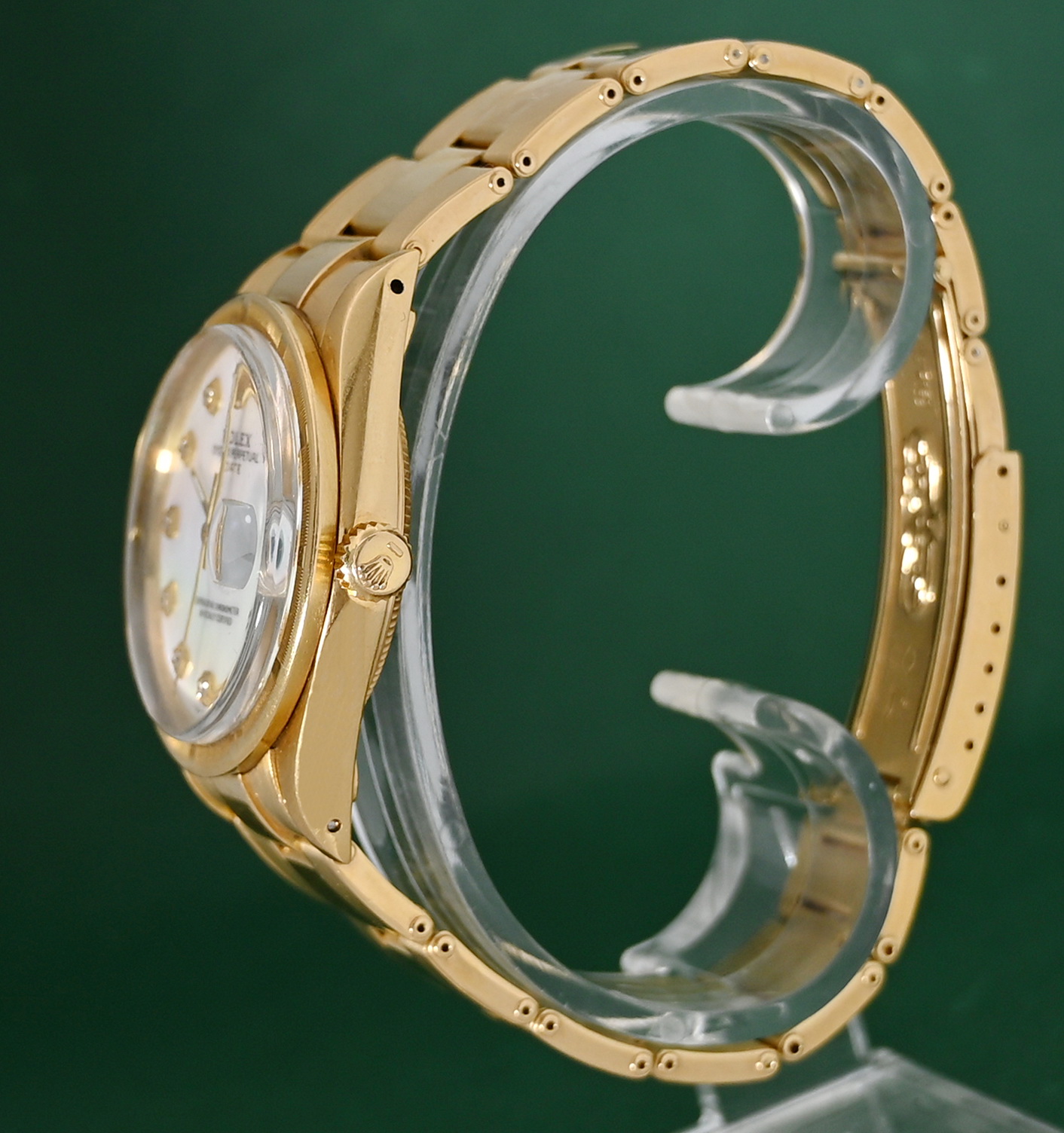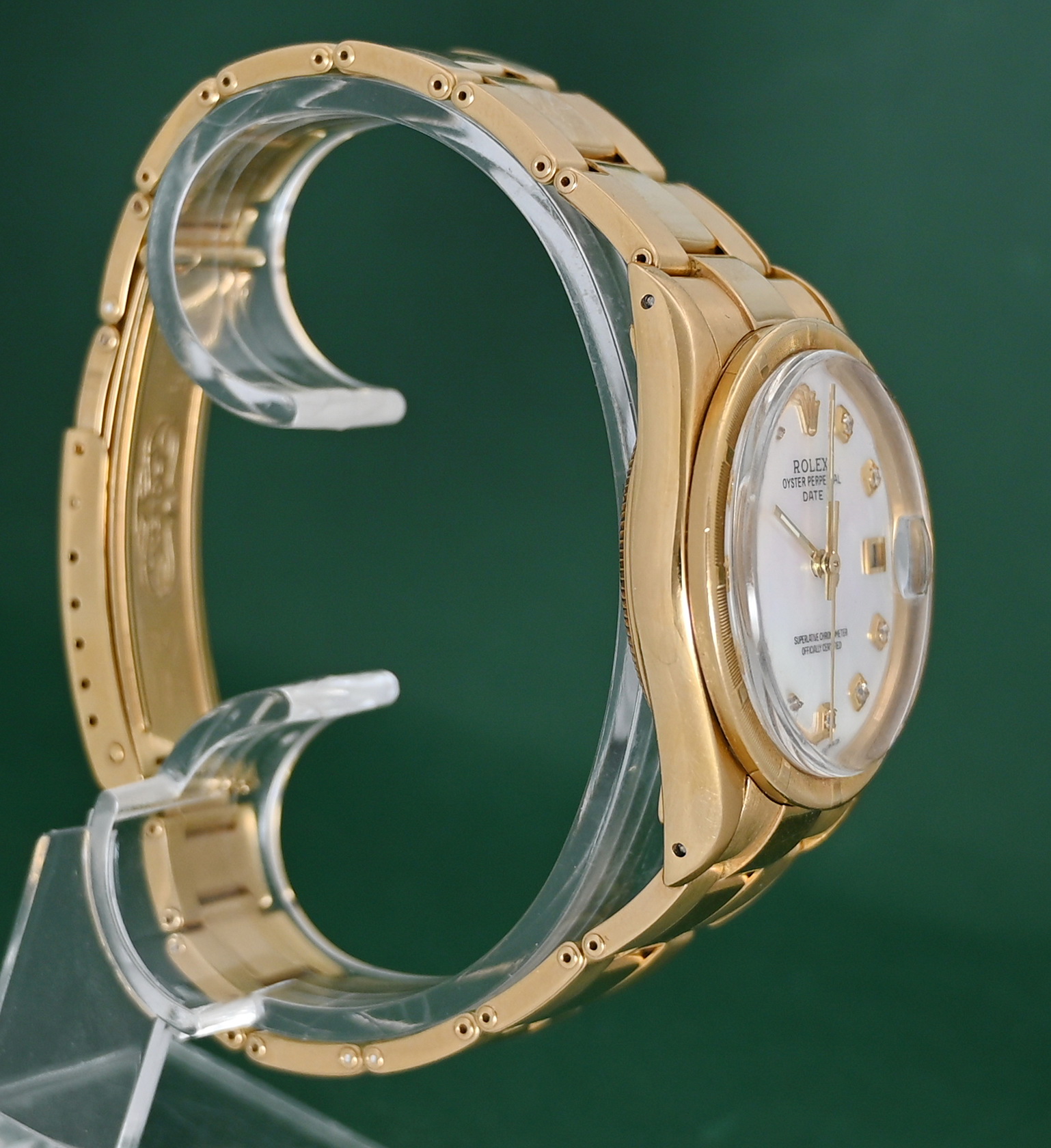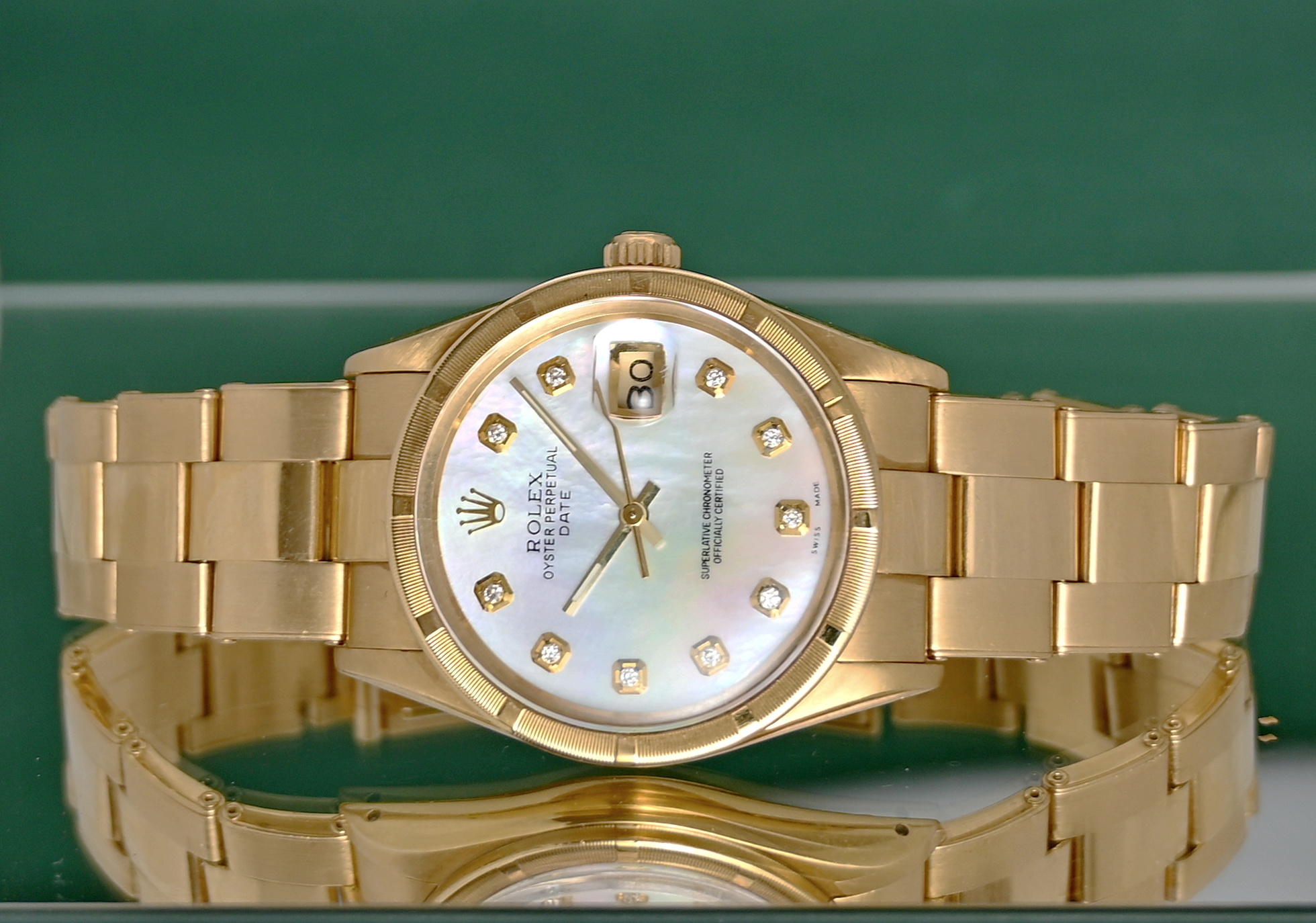 The Rolex Oyster Perpetual Date (Reference 15018) from 1984 is a rare, luxury vintage timepiece characterized by its 18k solid yellow gold construction and mid-size 34mm case. While this model standardly featured champagne or silver dials, the inclusion of a Mother of Pearl (MOP) dial makes it a particularly distinctive "boutique" configuration for collectors.