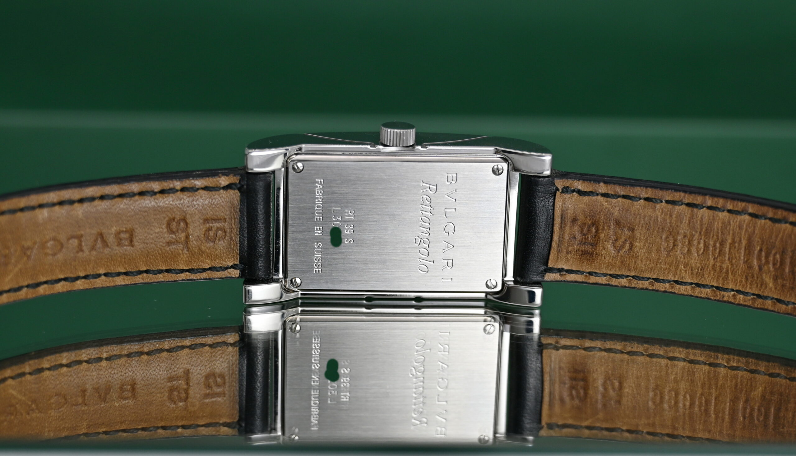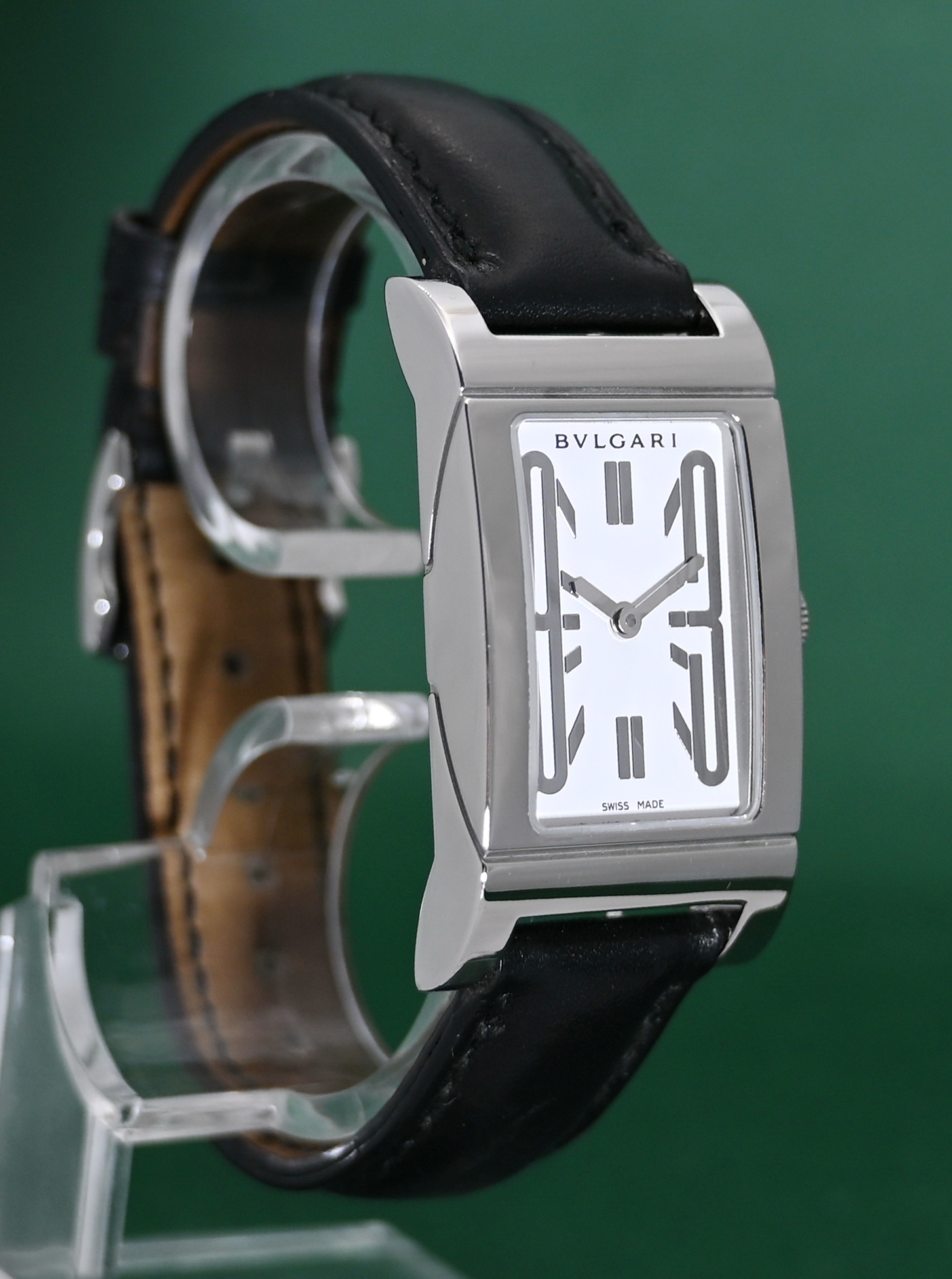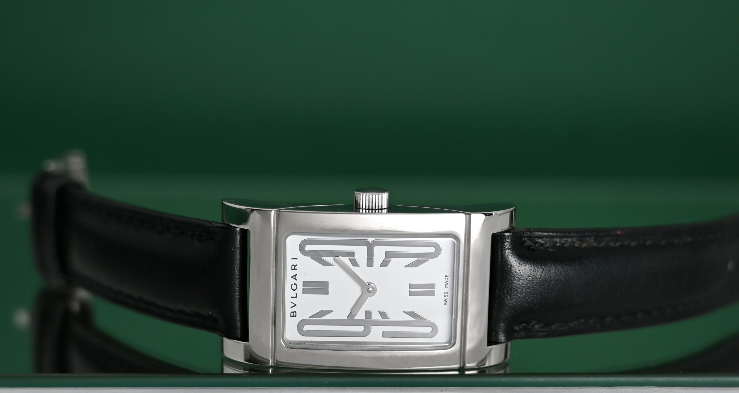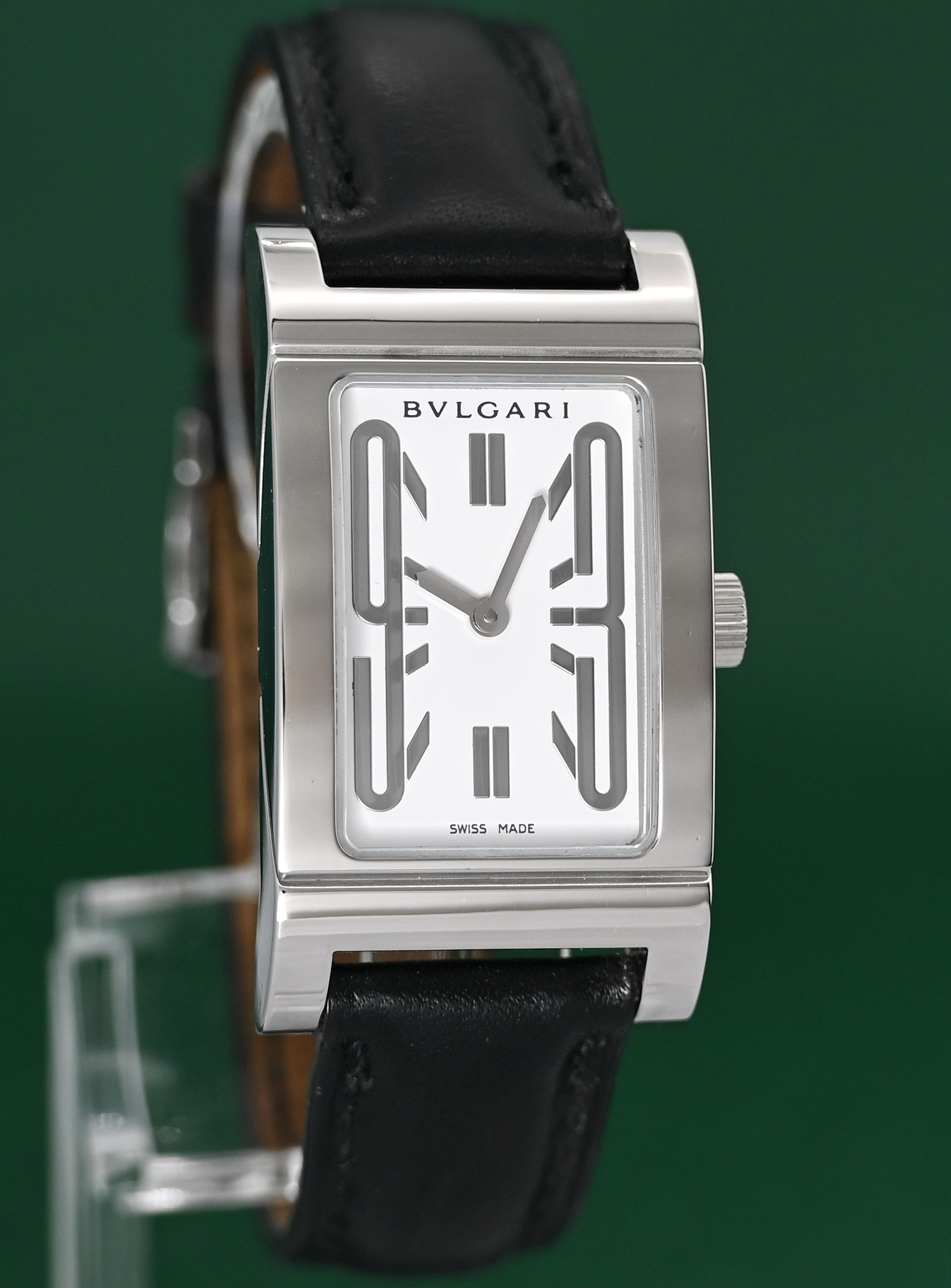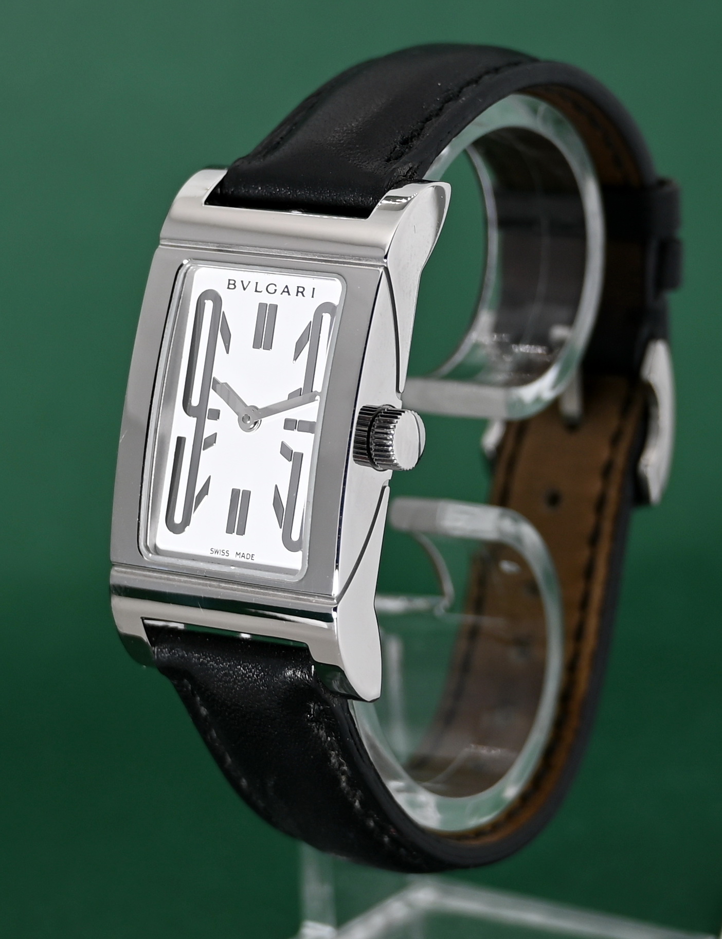 The Bulgari Rettangolo RT39S Lady is a distinctive luxury timepiece featuring a contemporary rectangular design that draws inspiration from 1930s architectural styles. This specific reference is defined by its polished stainless steel construction and a clean white dial.
