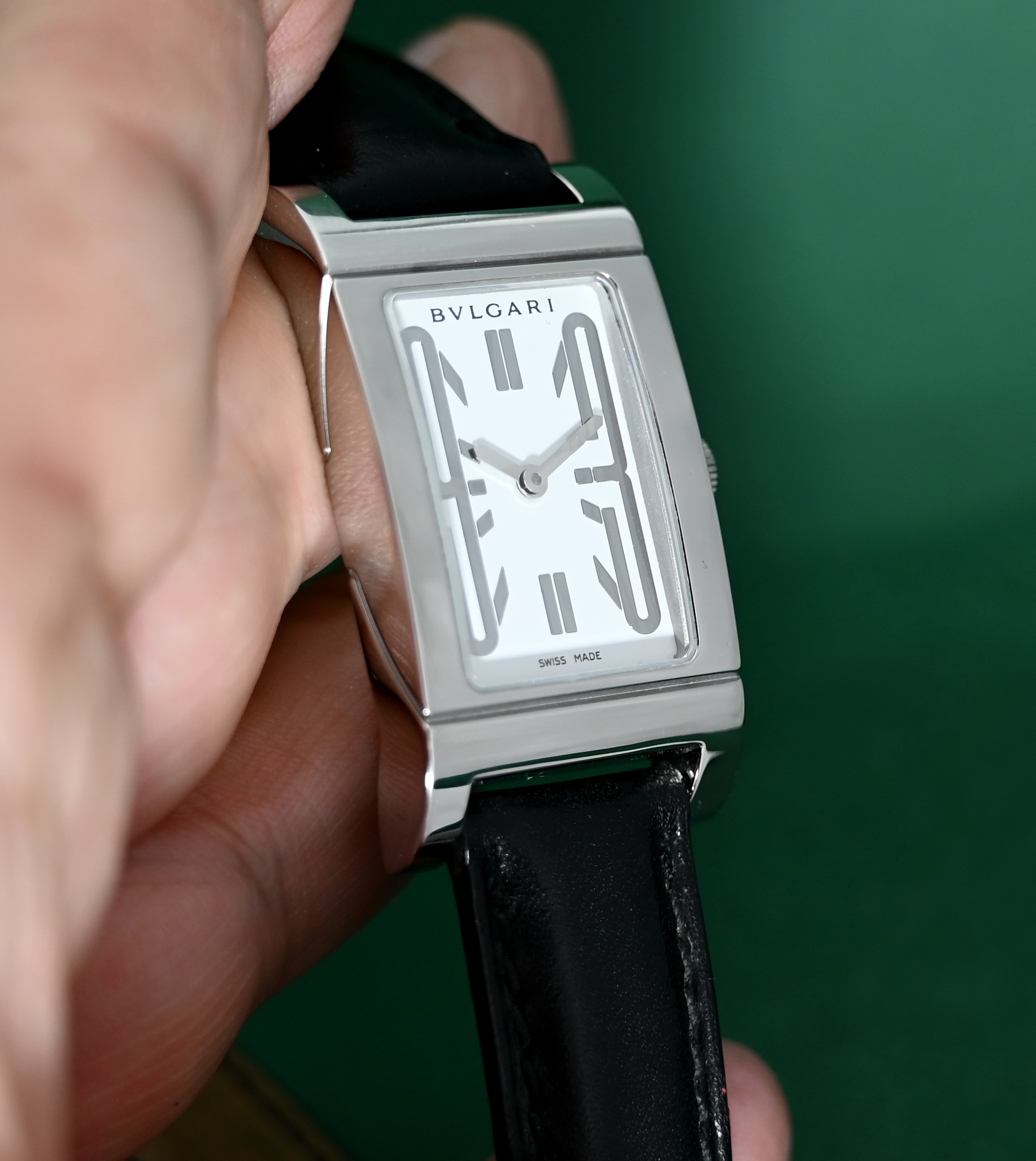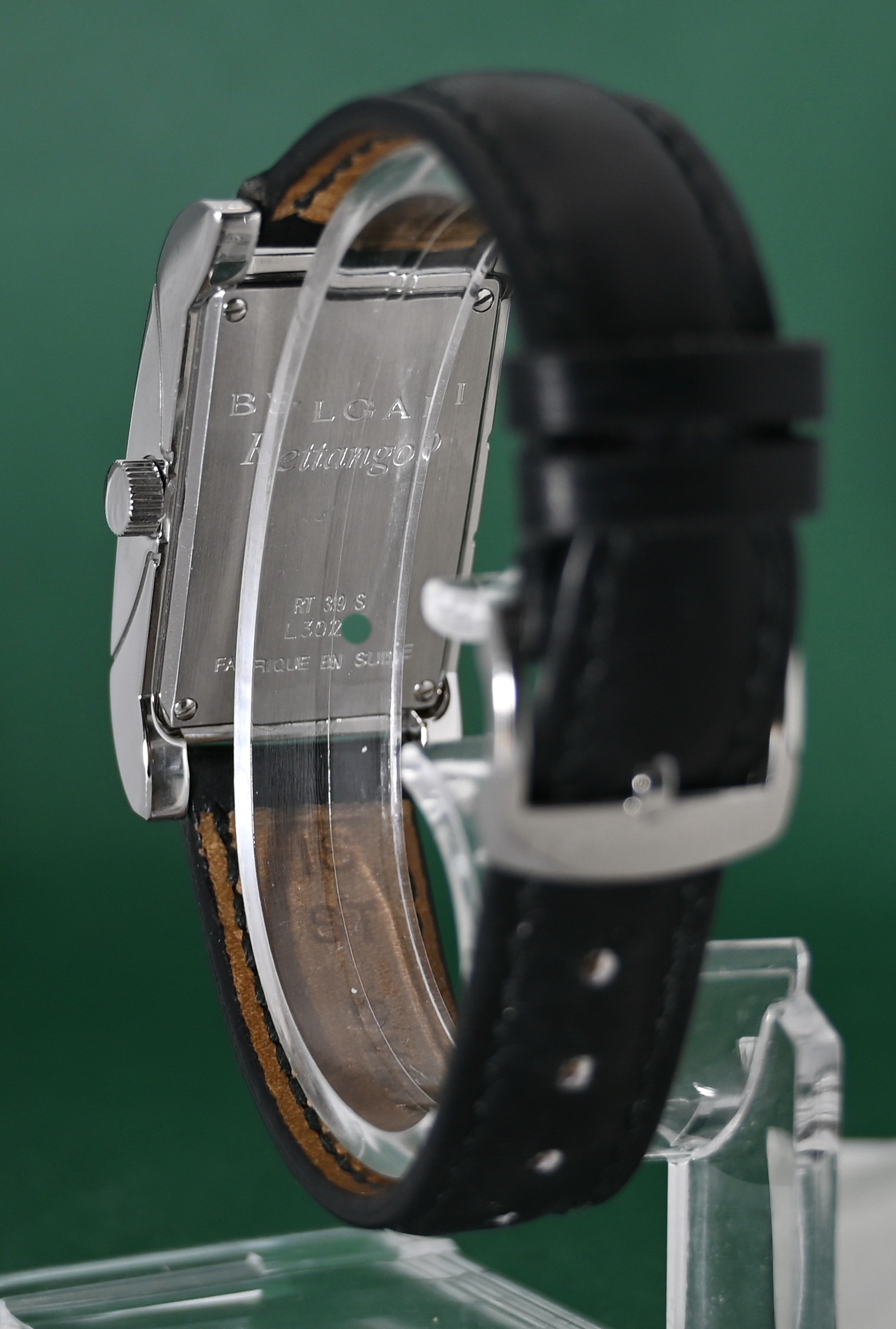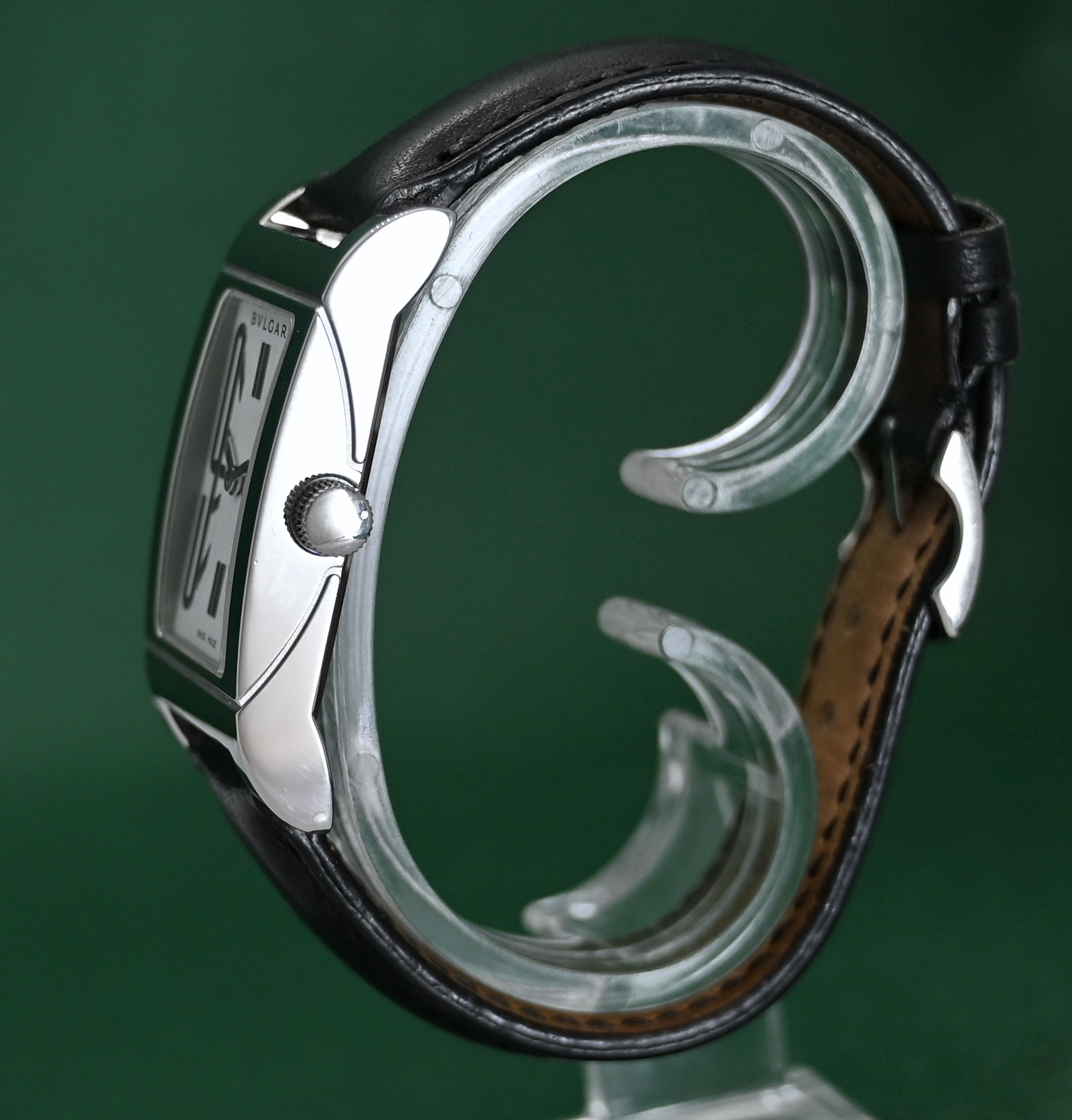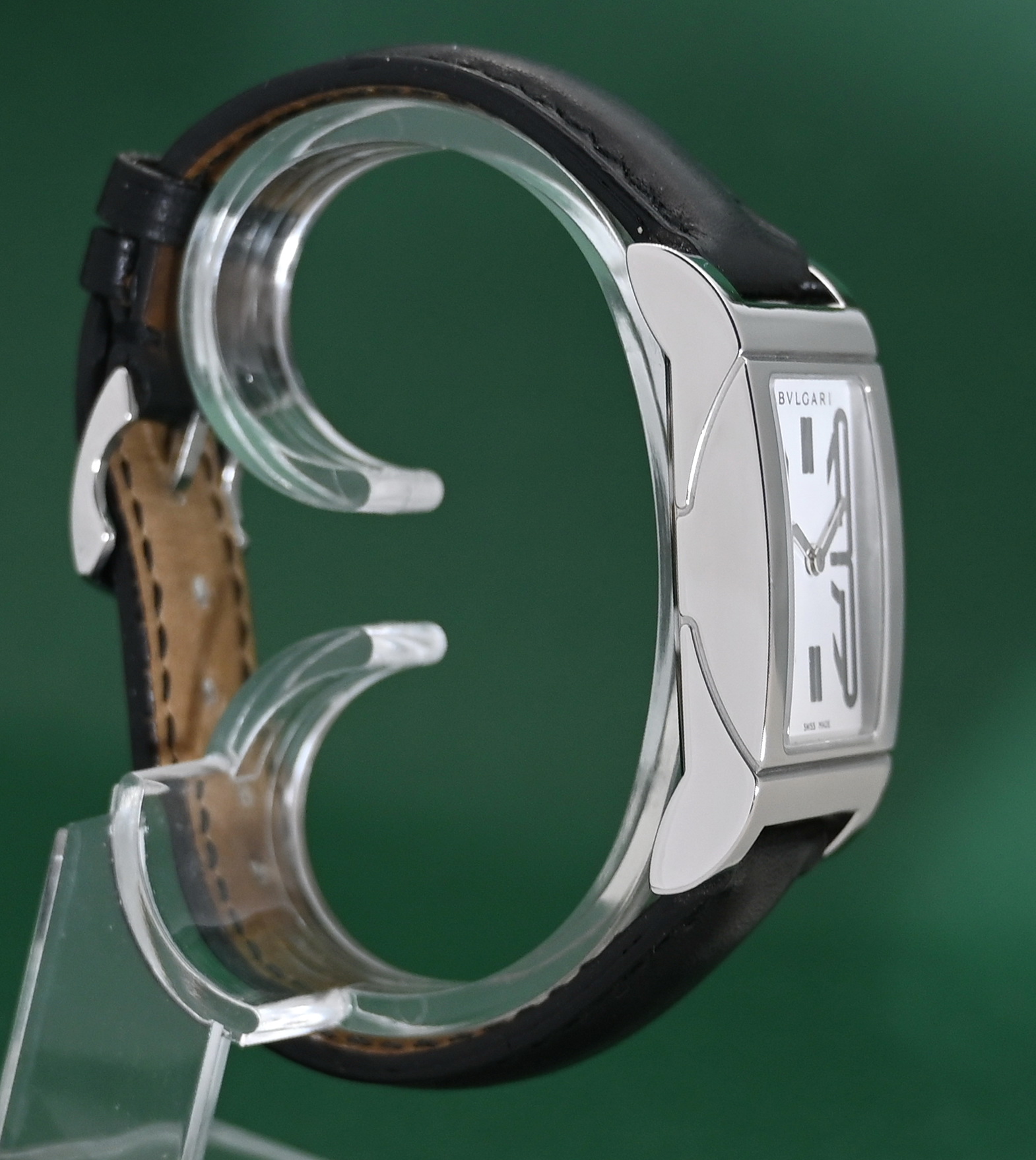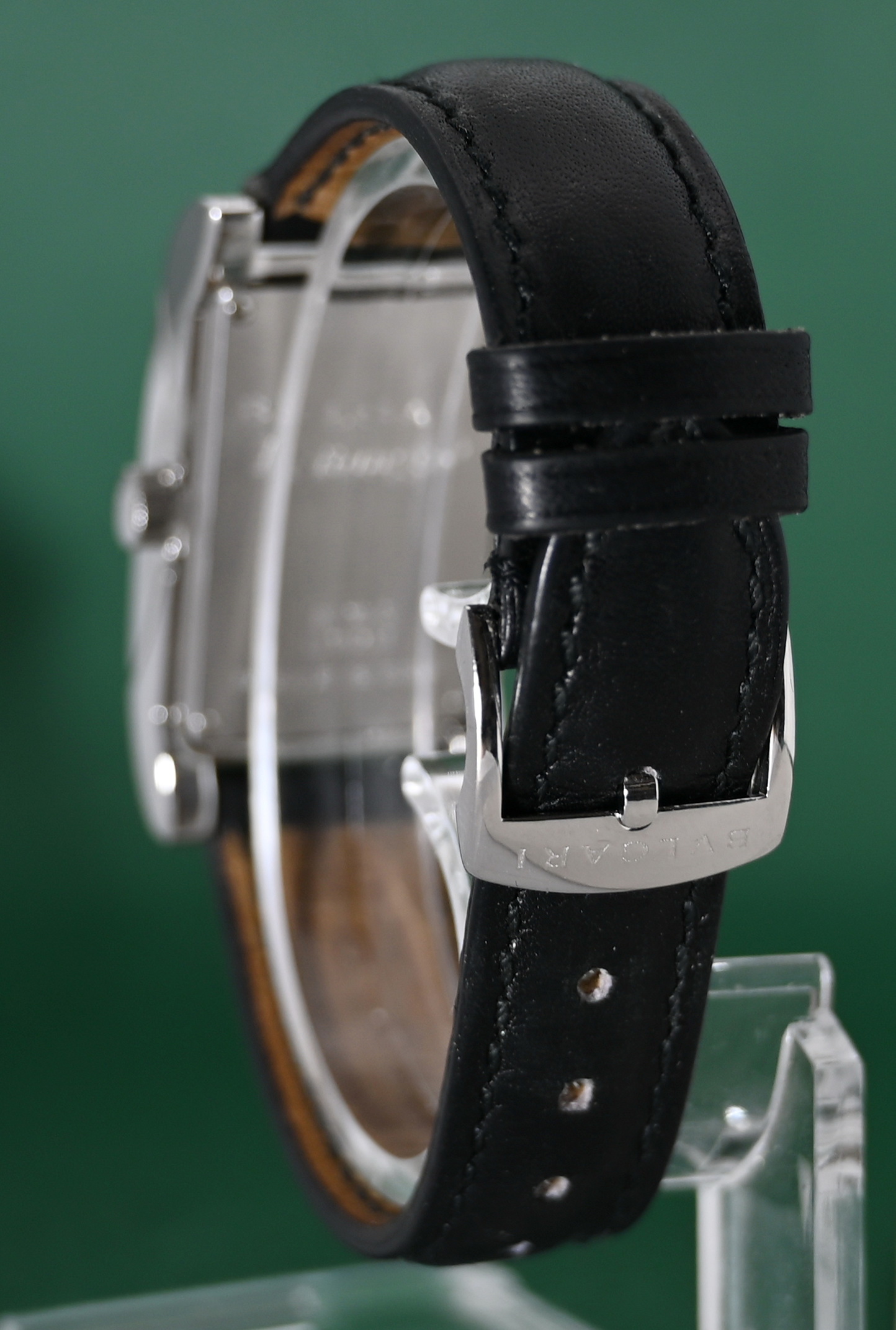 The Bulgari Rettangolo RT39S Lady is a distinctive luxury timepiece featuring a contemporary rectangular design that draws inspiration from 1930s architectural styles. This specific reference is defined by its polished stainless steel construction and a clean white dial.