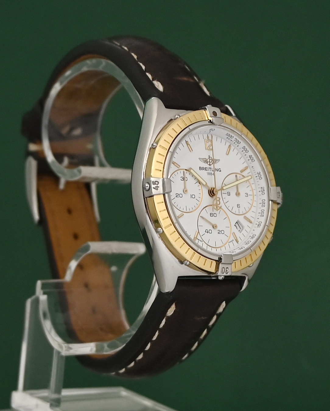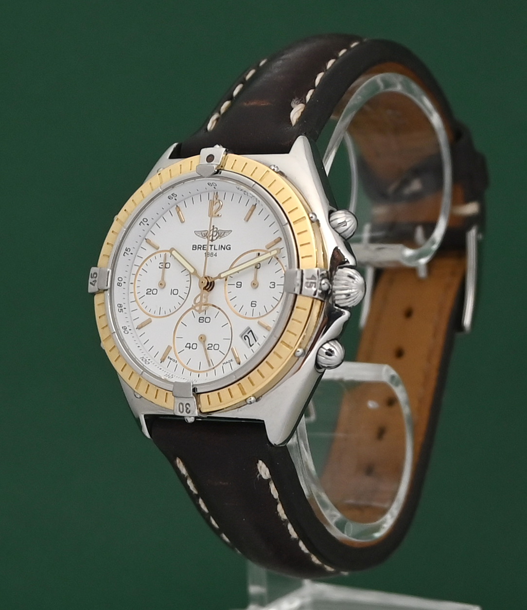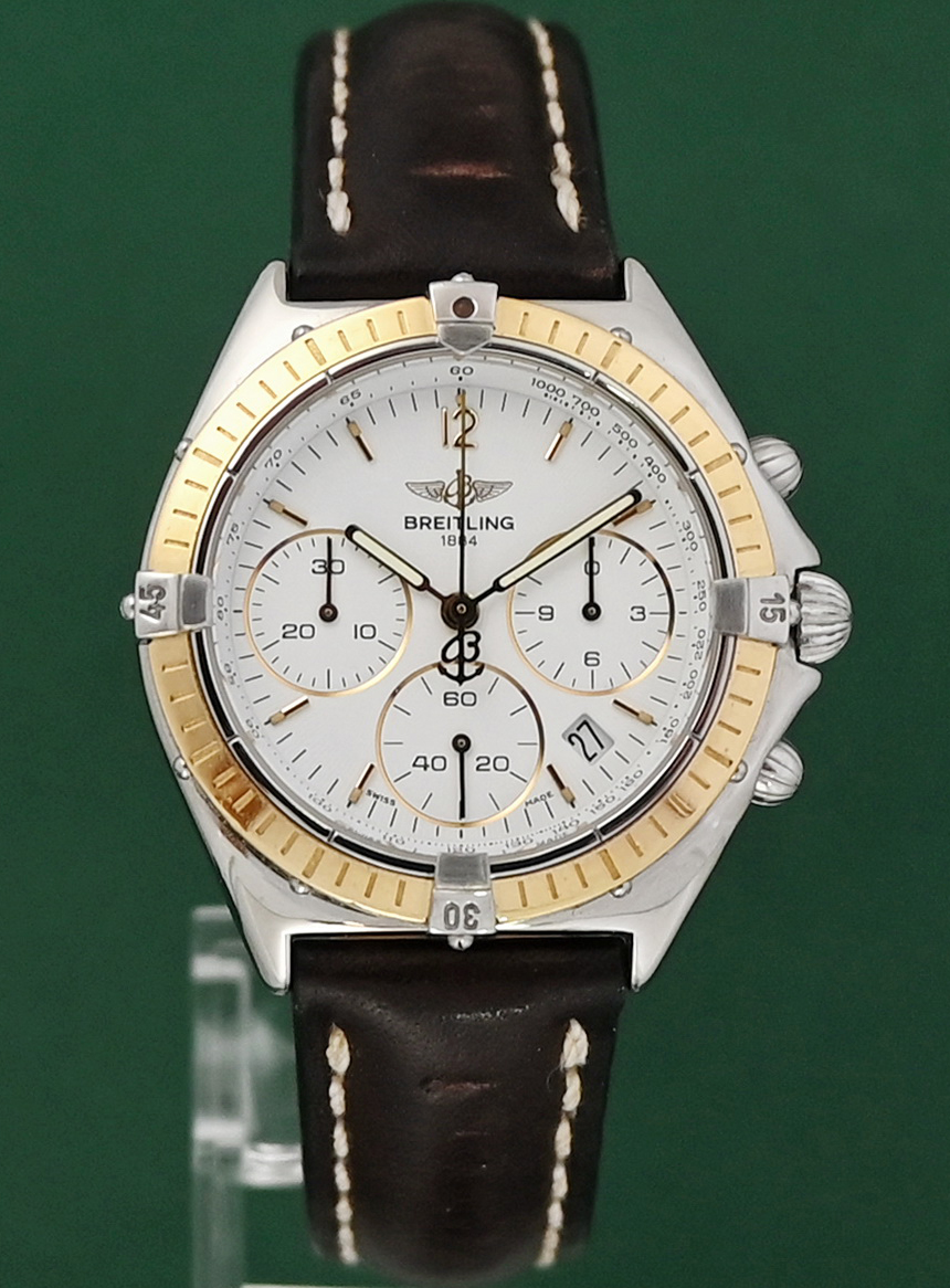 The Breitling Sextant (Ref. B55045/D55045) is a luxury chronograph watch from the 1990s, notable for its unique MecaQuartz movement that combines quartz timekeeping with a mechanical chronograph module. The specific configuration you mentioned features a two-tone design with an 18k yellow gold bezel and riders on a stainless steel case, paired with a classic white dial.