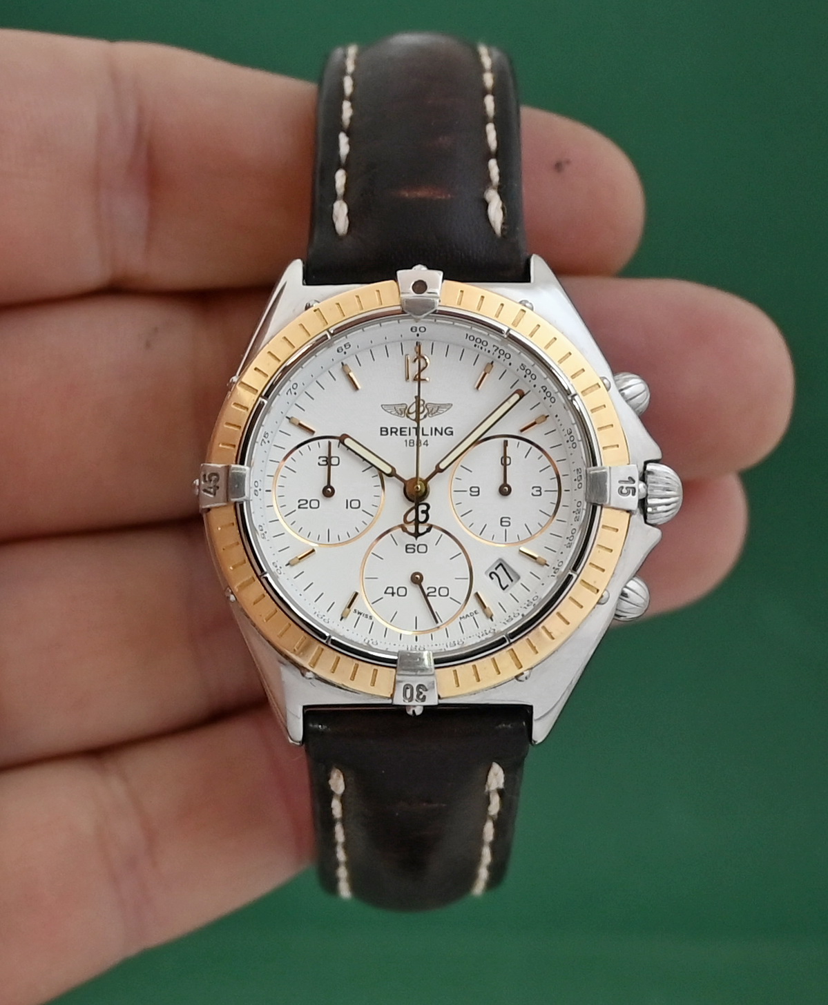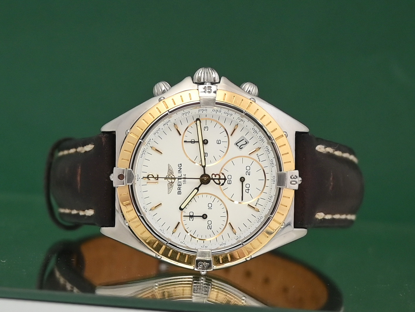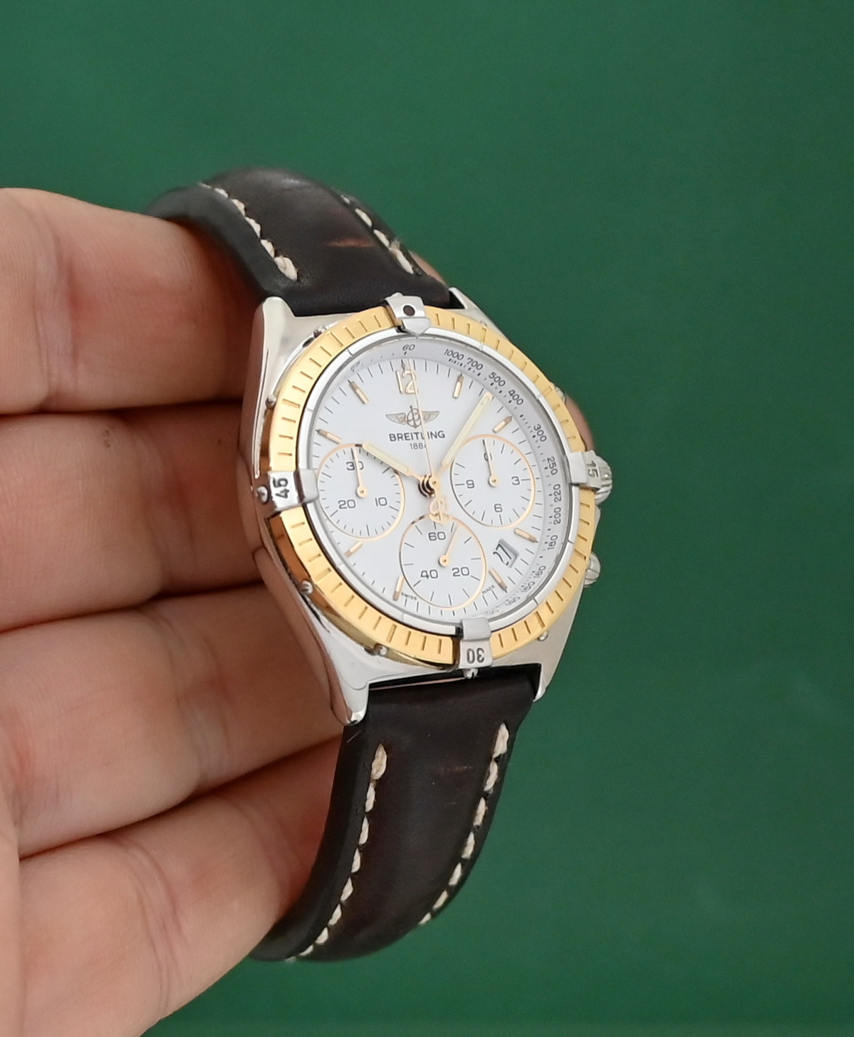 The Breitling Sextant (Ref. B55045/D55045) is a luxury chronograph watch from the 1990s, notable for its unique MecaQuartz movement that combines quartz timekeeping with a mechanical chronograph module. The specific configuration you mentioned features a two-tone design with an 18k yellow gold bezel and riders on a stainless steel case, paired with a classic white dial.