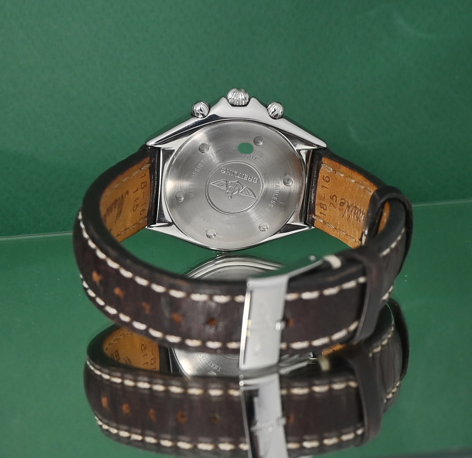 • Movement: Powered by the Frederic Piguet Caliber 1270 (Breitling B55), a "MecaQuartz" movement where the chronograph seconds hand sweeps smoothly at 1/5 second intervals, similar to a mechanical watch.