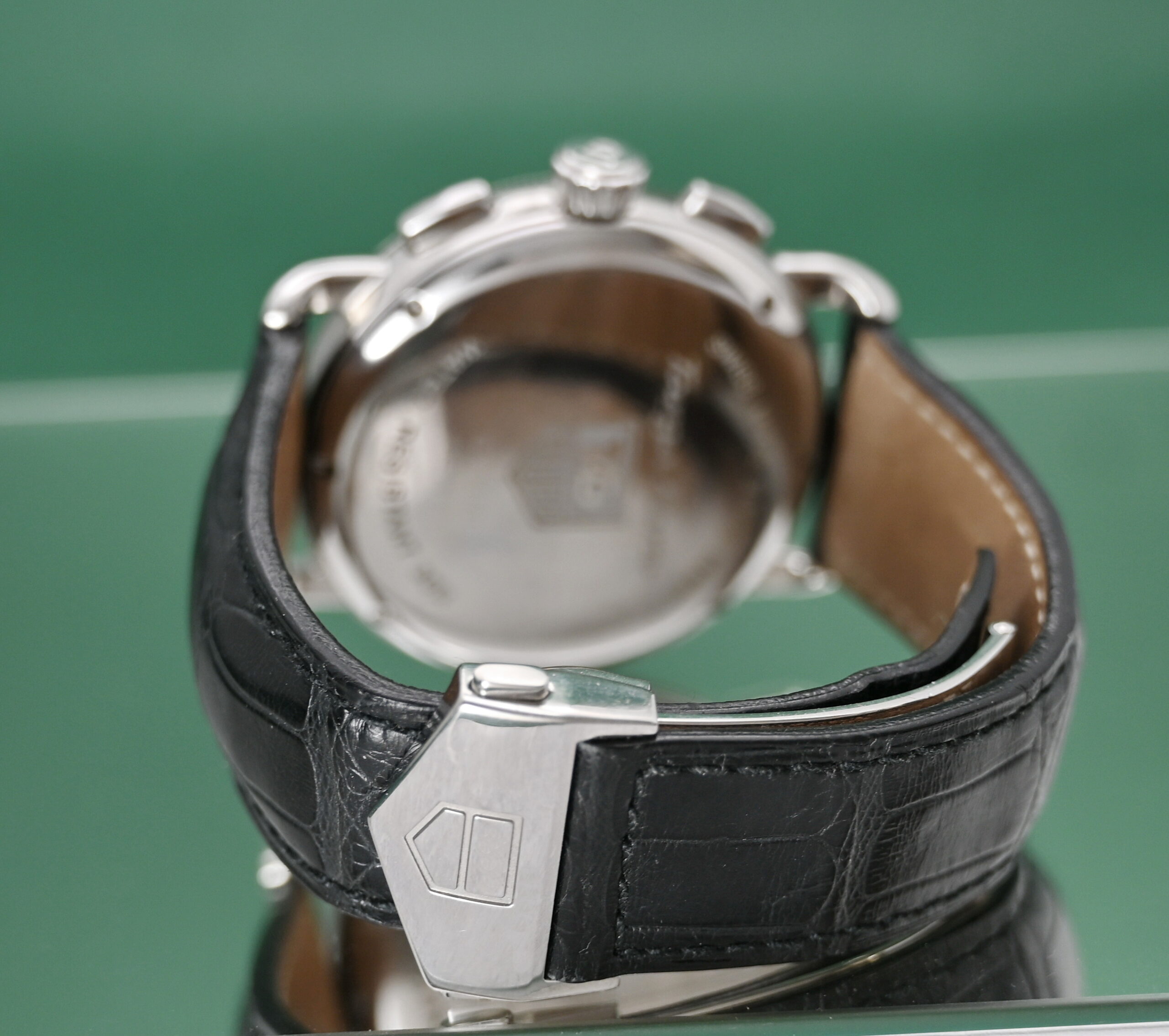 • Complications: Dual-register chronograph (30-minute counter at 9 o'clock, small seconds at 3 o'clock) and a date window at 6 o'clock.