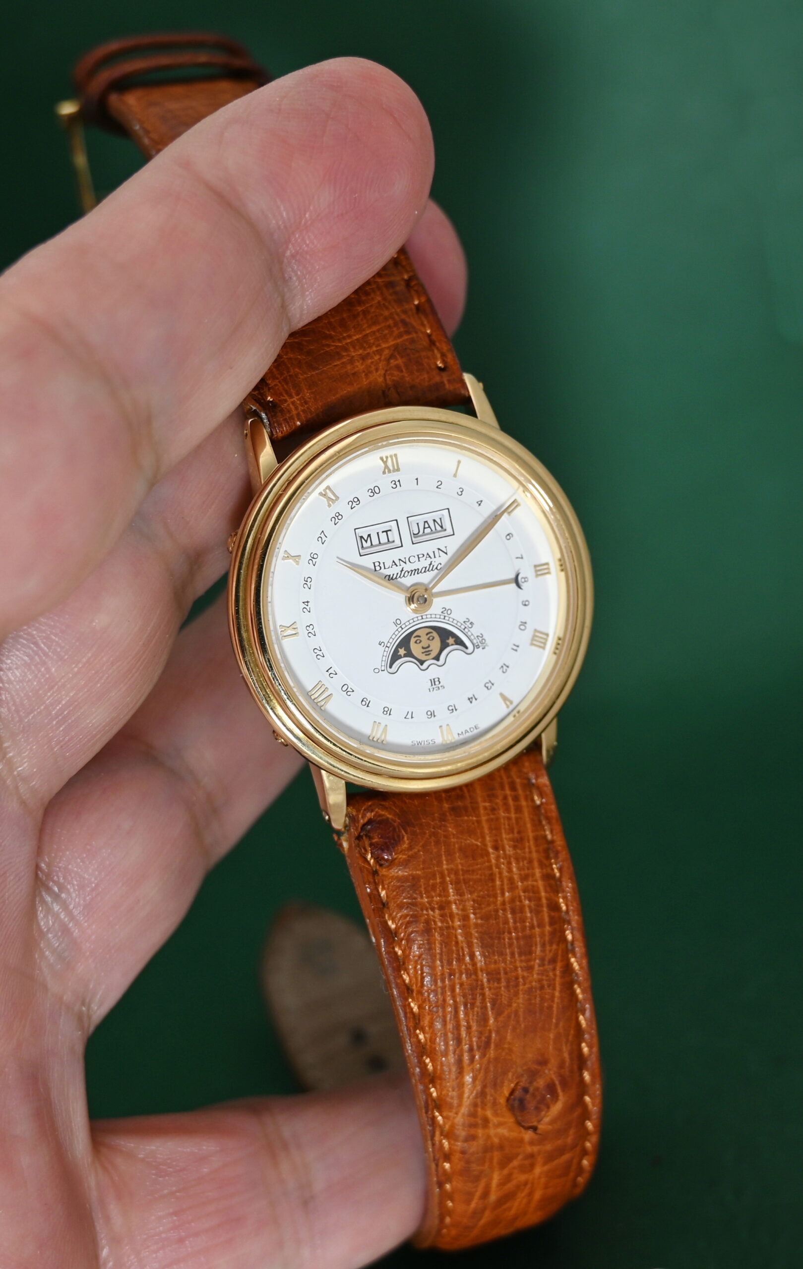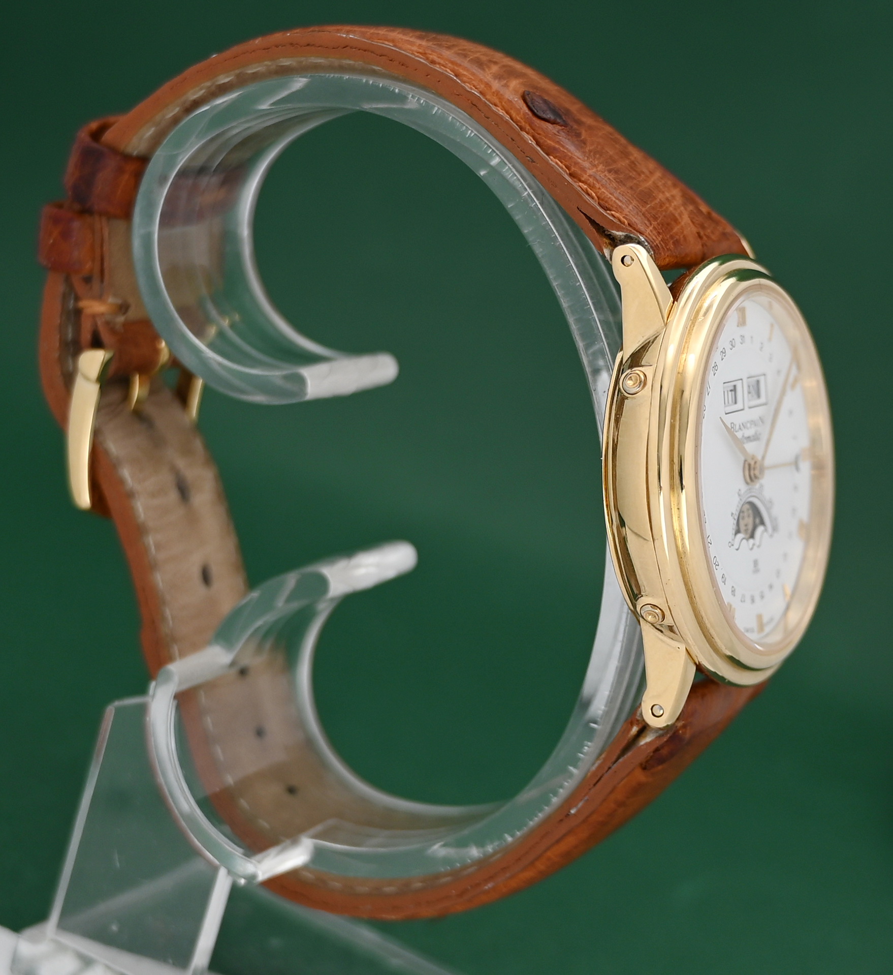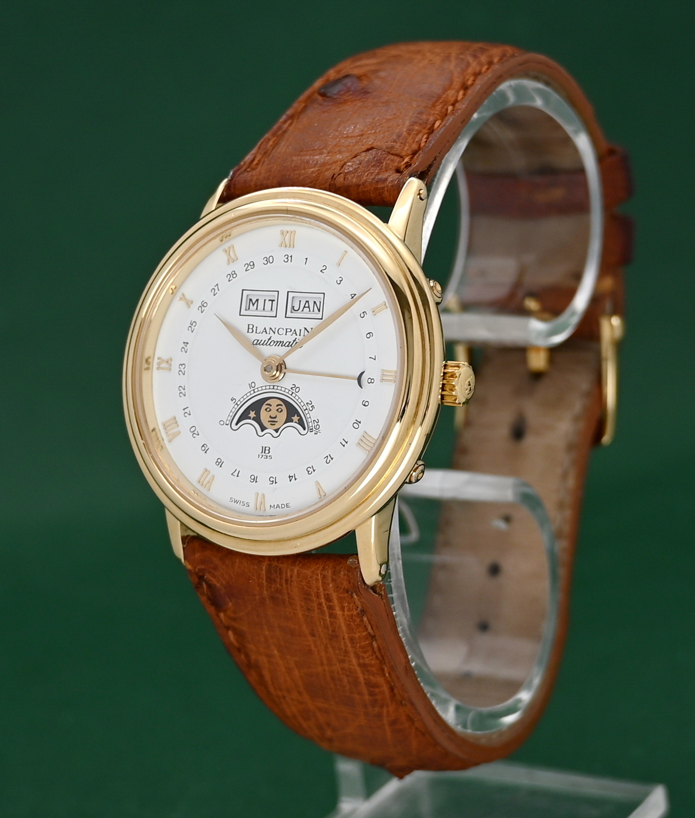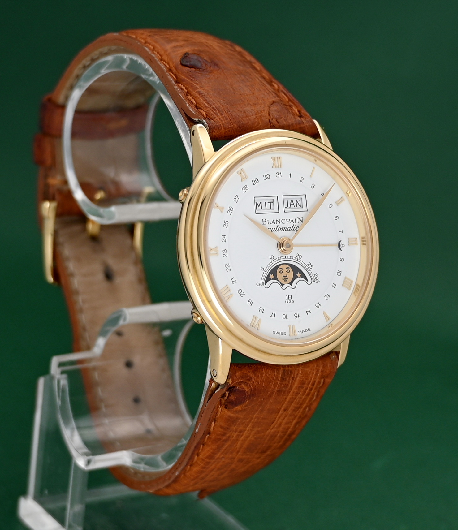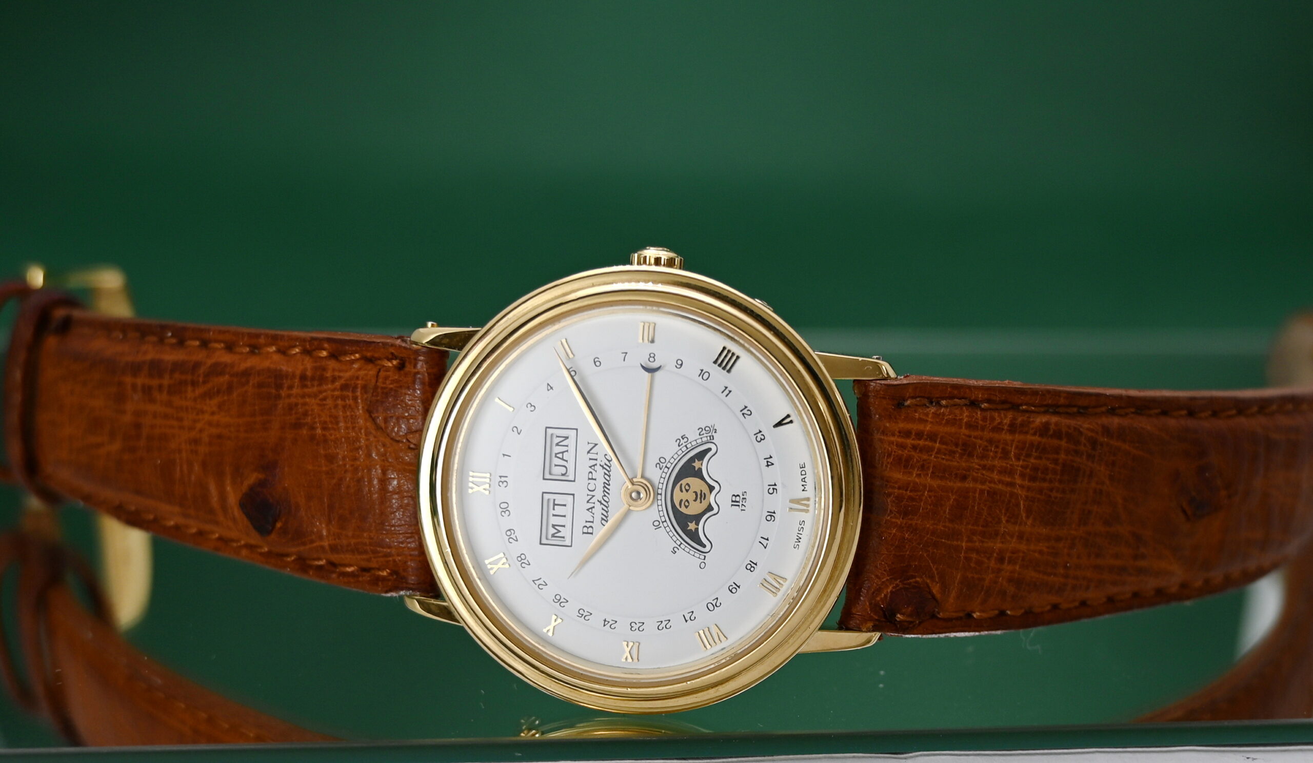 The Blancpain Villeret Moonphase Calendarium (Ref. 6595) is a cornerstone of the brand's 1980s and 1990s revival, designed as one of the original "Six Masterpieces" to reintroduce traditional mechanical watchmaking. This specific 34mm model is highly regarded for its ultra-thin profile and balanced triple calendar complications.