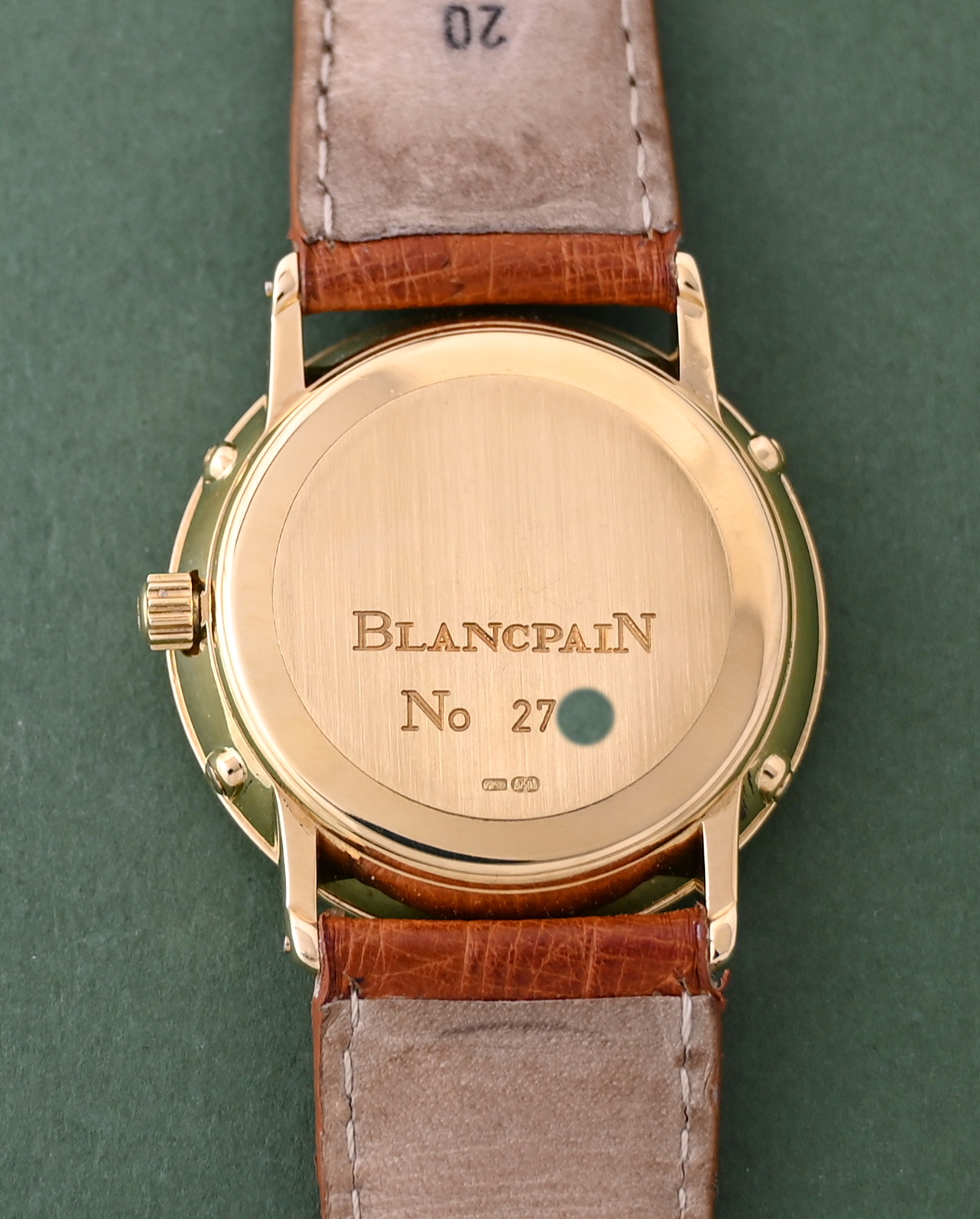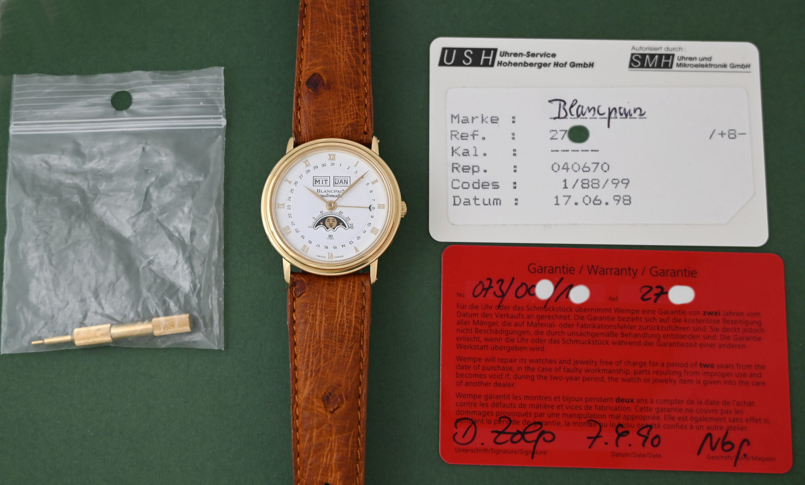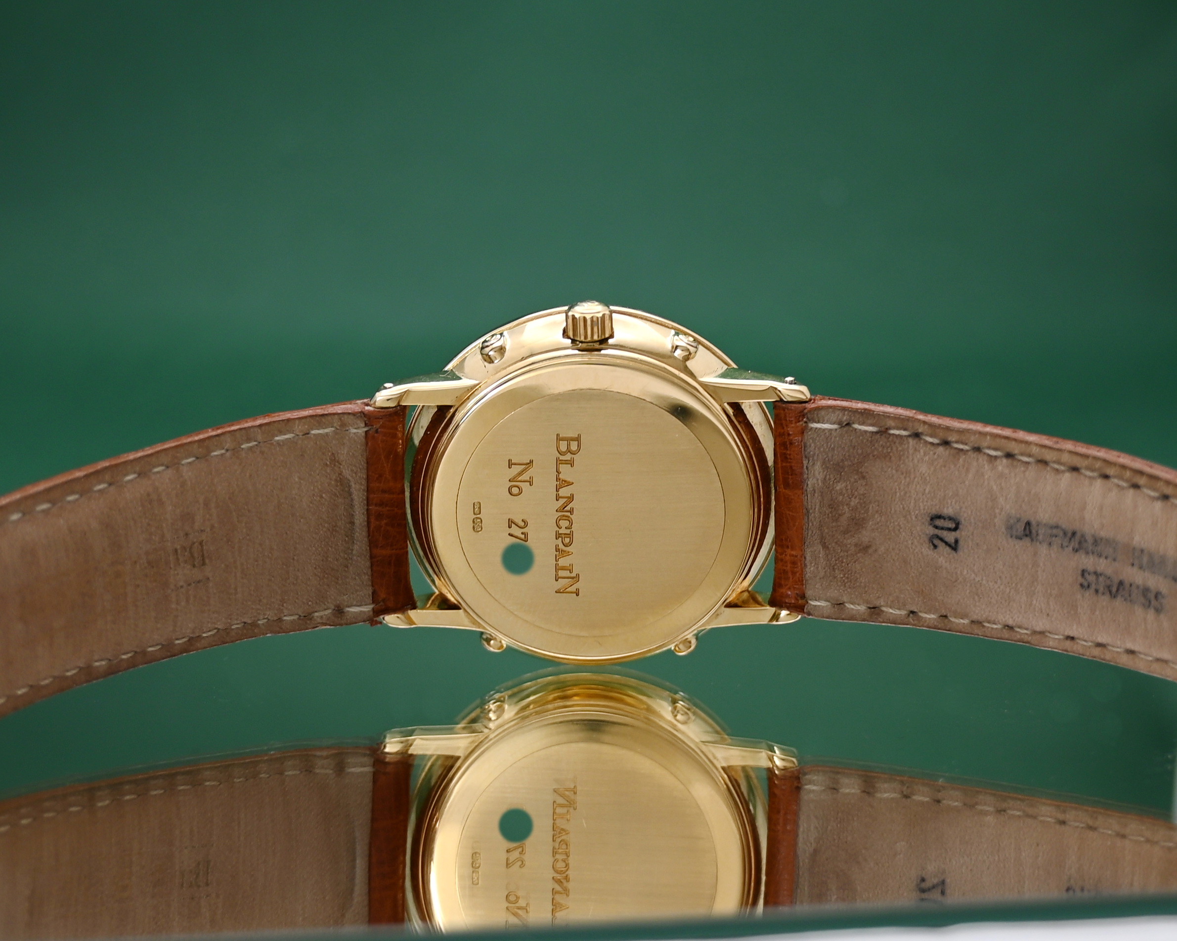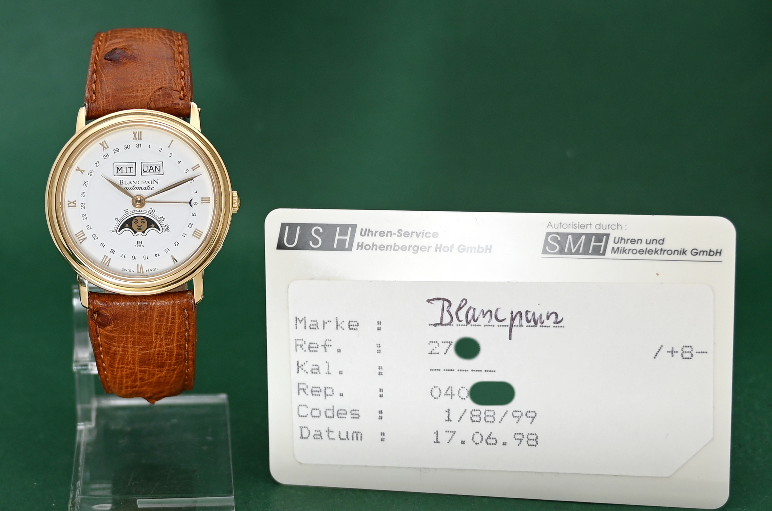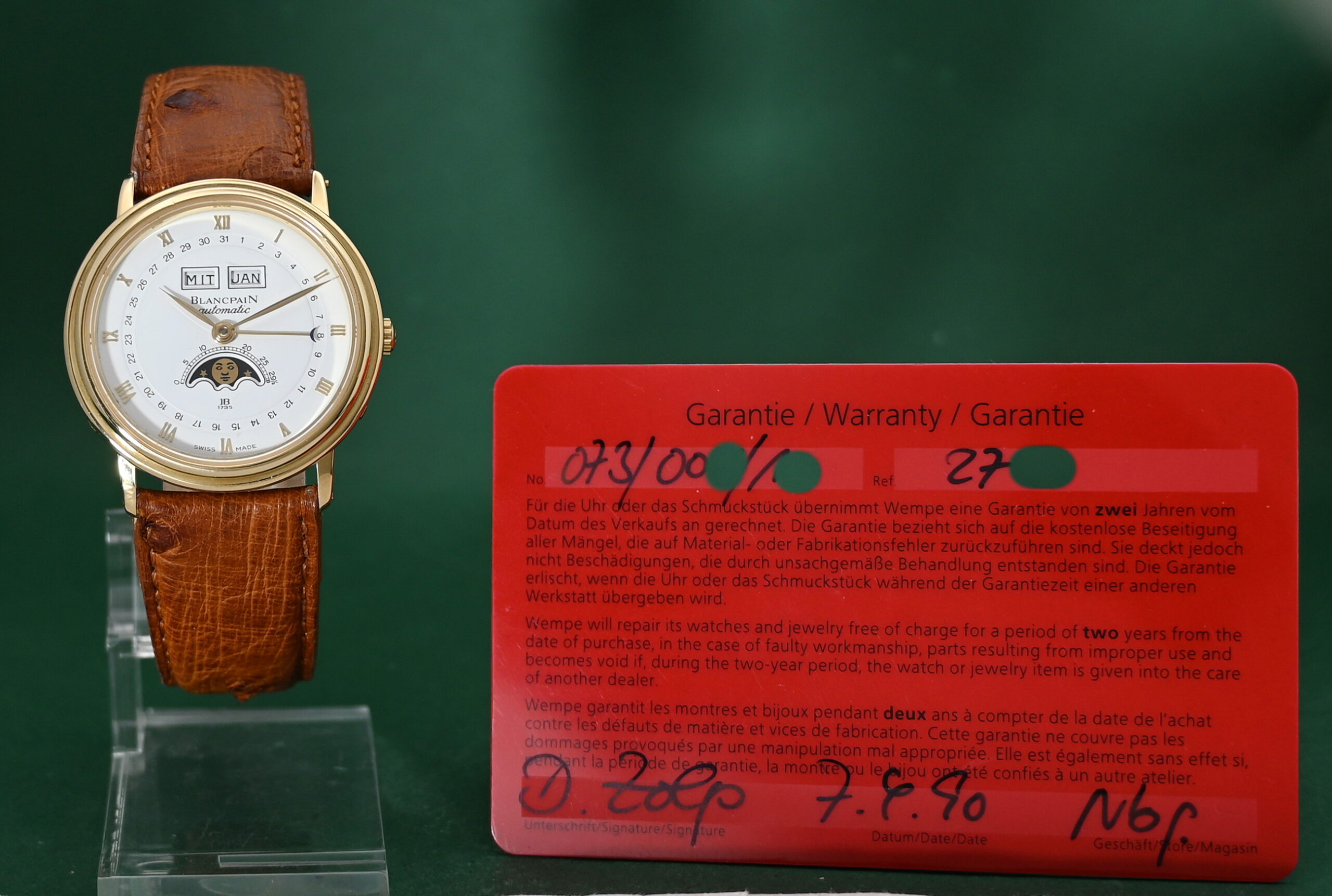 The Blancpain Villeret Moonphase Calendarium (Ref. 6595) is a cornerstone of the brand's 1980s and 1990s revival, designed as one of the original "Six Masterpieces" to reintroduce traditional mechanical watchmaking. This specific 34mm model is highly regarded for its ultra-thin profile and balanced triple calendar complications.