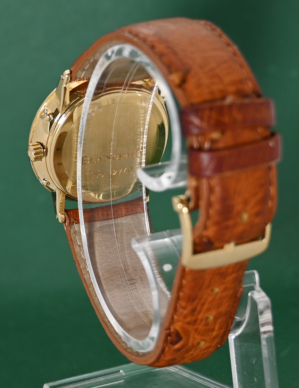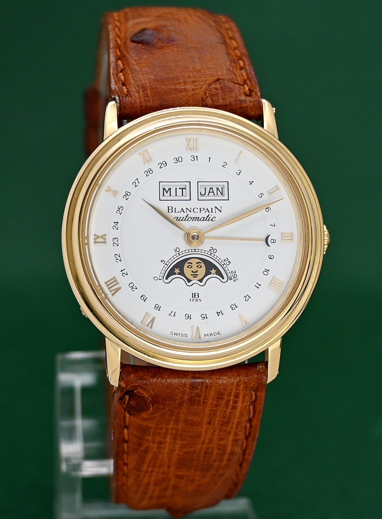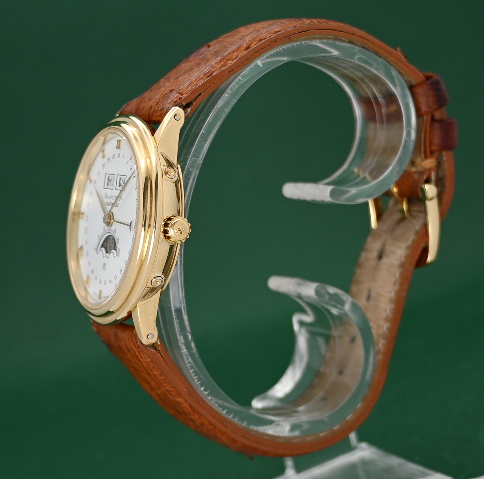 Complications: Triple Calendar (Day and Month windows at 12 o'clock, peripheral date hand) and Moonphase at 6 o'clock.