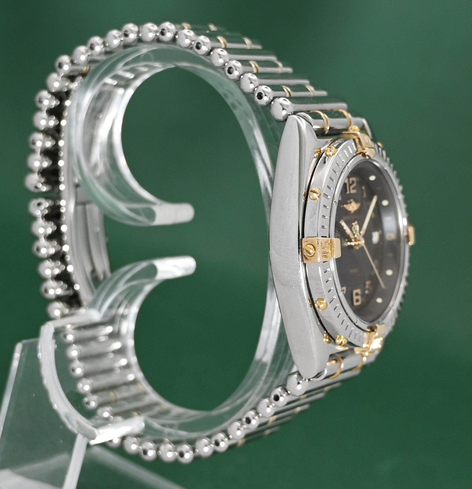 Materials: Stainless steel case with a solid 18k yellow gold unidirectional rotating bezel featuring signature "rider tabs".